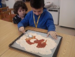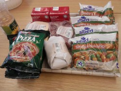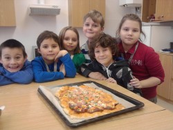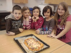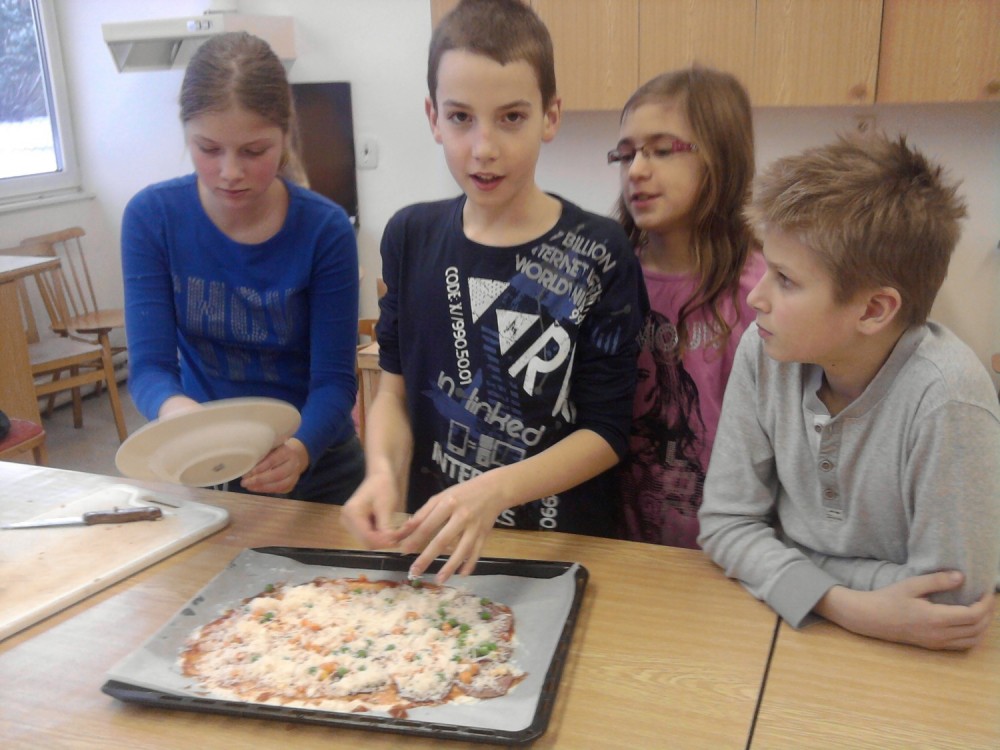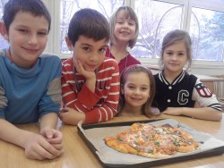 Dnes jsme s kuchaři pekli pizzu se saláme, šunkou, sýrem a zeleninou. Byla fakt výborná:)