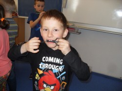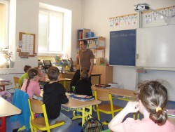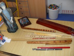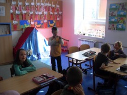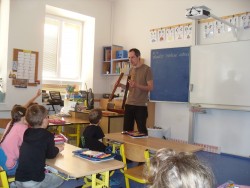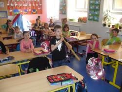 Ve čtvrtek k nám zavítal až z Rožnova pod Radhoštěm pan Drkula. Vzal s sebou spoustu zajímavých starých hudebních nástrojů - např.kouzelnou píšťalku ze dřeva, která neměla žádné dírky = KONCOVKA, strunný nástroj položený na dřevěný stůl - dobře zvučí = KOBZA,železný nástroj, který zní v ústech = BRUMLAČKA. Také nám pověděl, že se dochovalo několik starých písní, ze kterých se dozvídáme o minulosti Moravy. Jiné písně si děti dokonce zazpívaly i s doprovodem na nástroje, např. písničky o generálu Laudonovi, písnička o Kačence, která šla pro vodu k bílému Dunaju, měla si vzít Turka a lstí se ze svatby dostala a ještě byla bohatá (doprovod na ručně zdobenou flétnu). Pan Drkula nám přinesl ukázat i staré obrázky s Jiříkem malované na sklo, vyřezávanou postavu svatého Jiřího, ...