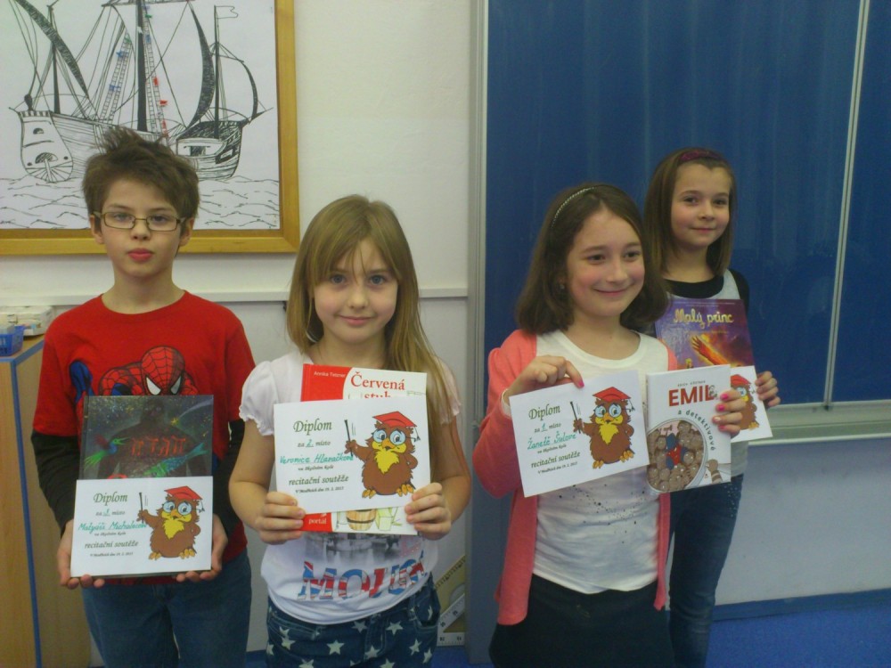 19. 2. 2015 Žaneta Šulová a Veronika Hlavačková - to jsou šikovné recitátorky naší třídy. Zvítězily ve své kategorii, i když to, v konkurenci se třeťákama, neměly vůbec jednoduché. Obě postupují do dalšího kola, tak jim džme palce. 23 / 2 / 2015 EN