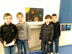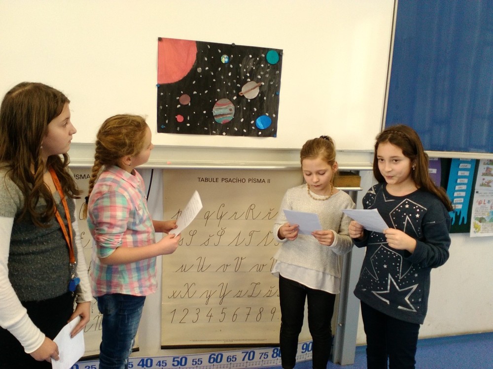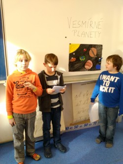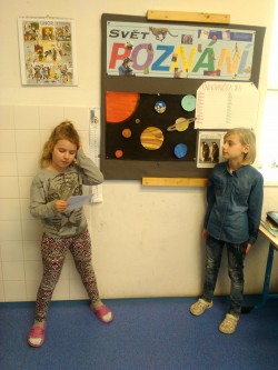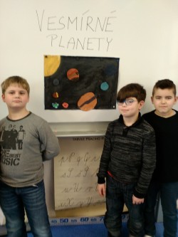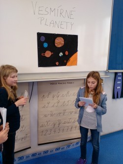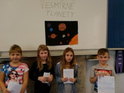 V prvouce jsme se učili o neživé přírodě. Tuto velkou kapitolu jsme uzavřeli svými prezentacemi o vesmírných planetách. Paní učitelka nás rozdělila do skupin s úkolem namalovat planety ve Vesmíru. Každý z nás si měl vybrat dvě planety, které namaloval a také nás o nich měl  poinformovat. Své práce jsme si vzájemně představili a paní učitelka všechny pochválila a ocenila jedničkou.