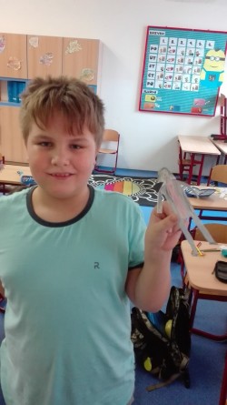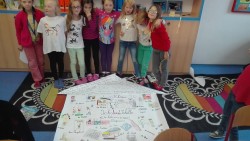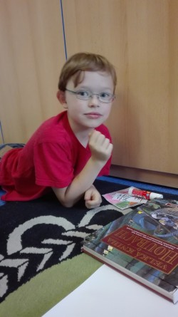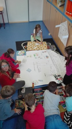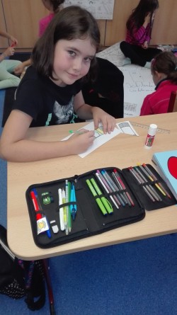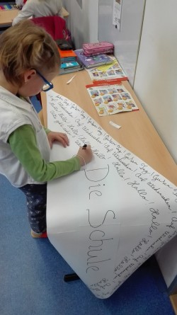 Tématem, které nás provázelo po celý den, byla "Škola". Slovíčka jsme měli předem přichystaná na dvou lístečcích se stejným obrázkem. Jeden lísteček byl však v jazyce německém a druhý lísteček s českým překladem jsme si museli podle obrázku hledat po třídě. Když jsme našli dva stejné lístečky, začal výtvarný kolotoč. Dostali jsme předtištěný obrázek, paní učitelka z něj větší část ustřihla a my museli zbytek libovolně dokreslovat. Práci nám zpříjemňoval poslech mluveného slova - pohádek bratří Grimmů.