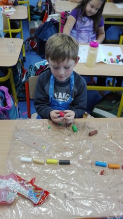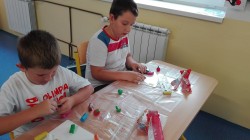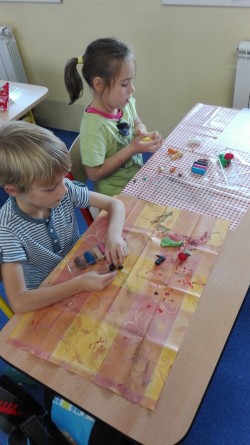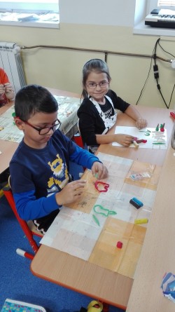 Blížíme se k polovině října a my už umíme několik písmen. Umíme je poznat v učebnicích, najdeme je na pracovních listech, bojujeme s jejich psaním. V jedné hodině pracovních činností jsme se rozhodli, že písmenka zkusíme také vymodelovat. Písmena A, L, M a E byla vymodelována za chvíli. Zabrousili jsme tedy společně i do prvouky a snažili jsme se vymodelovat i ovoce a zeleninu dozrávající na konci léta a na podzim. To už byl pro mnohé větší oříšek. Děti to ale nakonec vše zvládly a důkazem je naše "okenní výstava".