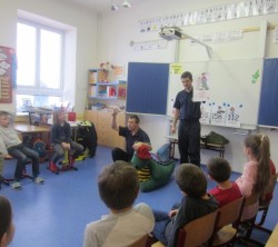 Konec prvního pololetí a den vydávání vysvědčení jsme oslavili velmi netradičně. Navštívil nás dráček Hasík, který nás s profesionálními hasiči učil správně přivolat pomoc při vzniku požáru. A to nejen teoreticky, ale děti měly možnost vyzkoušet vyťukat číslo na mobilu a nahlásit nebezpečnou událost operátorovi. Učily se zásadám předcházení vzniku požáru i základním pravidlům, jak oheň uhasit a vše si mohly s "ohněm na obrázku" vyzkoušet. Již teď se těšíme na další setkání s Hasíkem...