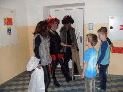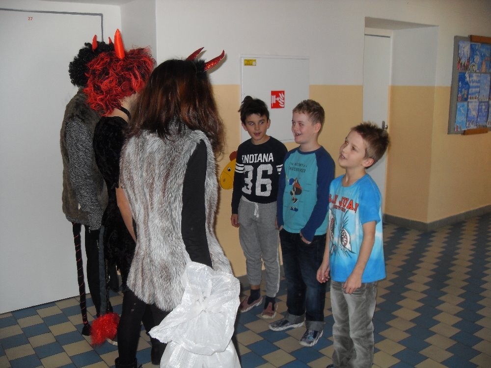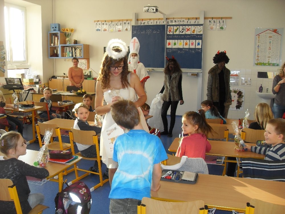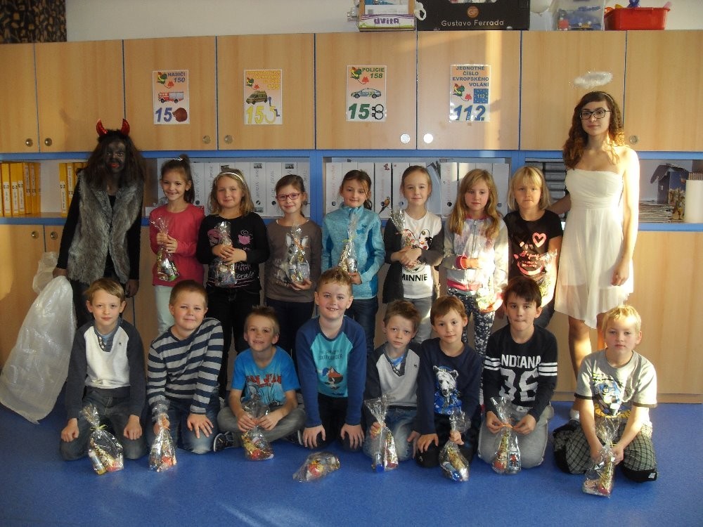 Dnes máme hodinu matematiku a v tom se najednou z ničeho nic ozve bouchání na dveře a rachocení řetězů, až se paní učitelka lekla... To nás přišli navštívit čerti, andělé a Mikuláš. A protože zlobivce by všechny neunesli, pořádně jim vyčinili alespoň za dveřmi. Andělům děti zazpívali a pověděli básničku, za což je Mikuláš odměnil malými dárečky.
