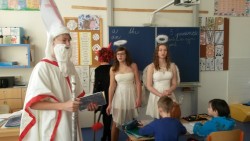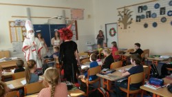 Dnes jsme přivítali v naší třídě Mikuláše s jeho družinou andělů a čertů. Mnohému z nás trochu zatrnulo, co kdyby...Někteří měli trošku namále, ale nakonec si čerti nikoho do pekla neodnesli a hodný Mikuláš nám nadělil balíček sladkostí.Třídu máme vyzdobenou čertíky , které jsme vyrobili v hodinách VV a PČ, tak se u nás čerti cítili jako doma.:-)