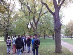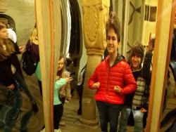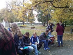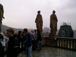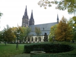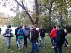 Naše první zastávka byla na Vyšehradě, místě vlády prvních Přemyslovců. Pod vedením poněkud nekonvenčního průvodce jsme vyrazili na průzkum celého vyšehradského areálu. Místo klasického výkladu jsme obdrželi baterky, MP3 se sluchátky a mohlo se začít. Nejprve jsme měli pocit, že jsme se ponořili do temných útrob hradu, ale vlastně jsme se pohybovali po skále, na níž byl hrad vystavěn, a na vlastní kůži pocítili význam stropních otvorů a průduchů. Netradiční pojetí prohlídky spočívalo v informacích, úkolech a instrukcích, jichž se nám individuálně dostávalo ze sluchátek od našeho průvodce a jež jsme plnili. Se zájmem jsme si prohlíželi originály soch z Karlova mostu, abychom je později mohli v reálu srovnat s jejich replikami, zjišťovali informace o lidech spjatých s tímto místem, identifikovali Myslbekova sousoší, obdivovali krásu i zajímavosti chrámu. Díky pěknému počasí jsme shlíželi na město pod námi a měli též pěkný výhled na protější Pražský hrad. Pomocí nápaditých pomůcek jsme mohli sledovat, jak v průběhu staletí měnil svou podobu, jak ho např. mohl vidět Karel IV. a jak ho vidíme nyní my. Nedílnou součástí tříhodinového programu bylo prozkoumání hřbitova slavných, tedy Slavína. Rozprchli jsme se po hřbitově a jali se vyhledávat místa odpočinku významných osobností, zapůjčeným náčiním čistili a upravovali nalezené hroby, neopomněli jsme ani zapálit svíčky. Takto prakticky pojatý výklad vzbuzoval u žáků zájem, tudíž je předpoklad, že si mnohé zapamatují.