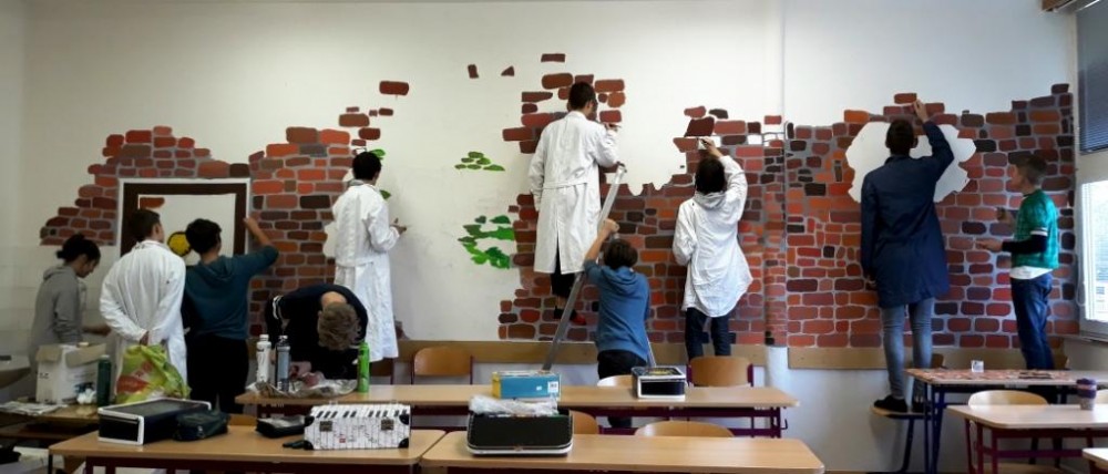 3. 2. 2020 Třídní kolektivní nástěnná malba. Technika - malba akrylovými barvami. Realizace vlastního návrhu - "Tajemného světa za zdí". 30 / 6 / 2020 HH