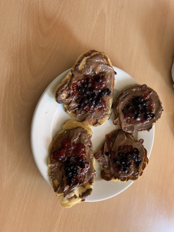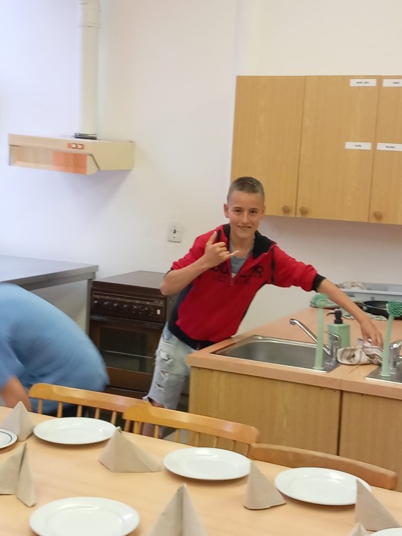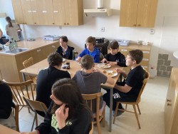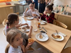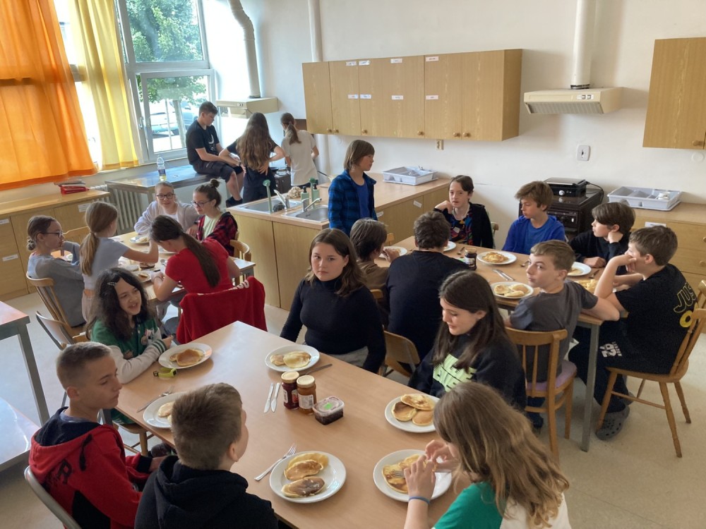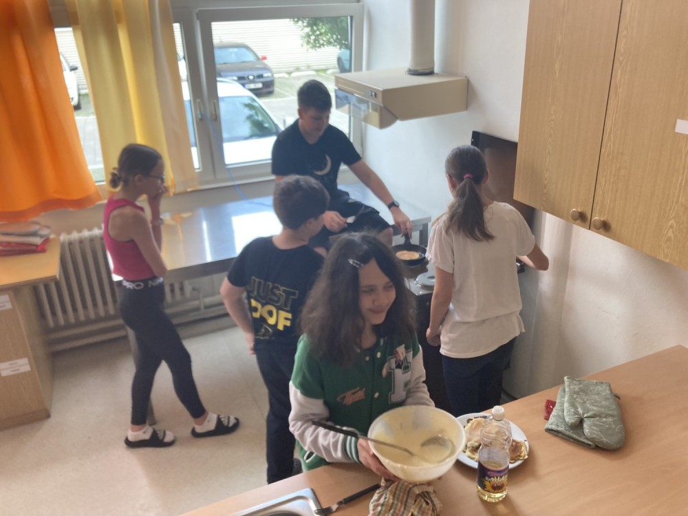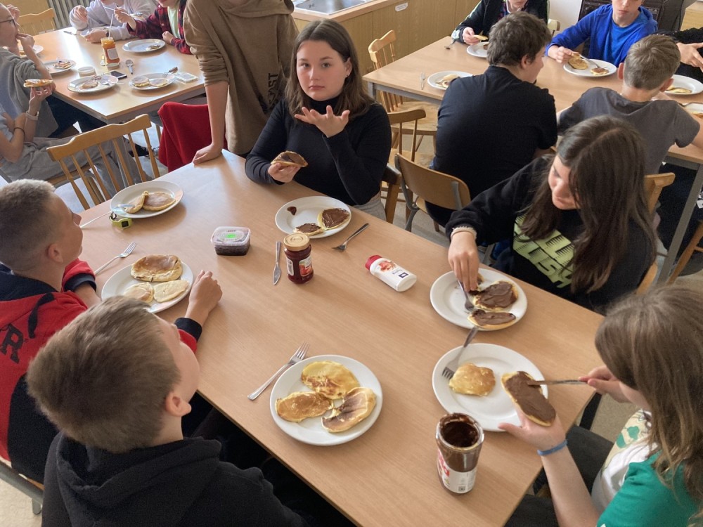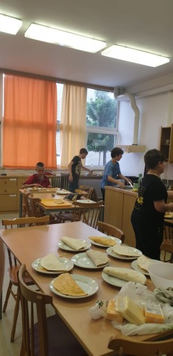 Žáci si vytvořili dvě výkonné skupiny pro zajištění stravování a využili prostor školní kuchyňky pro přípravu qurritos (večeře) pod vedením Seby M., následně si ráno přivstala dívčí skupinka Kamči I., která udělala všem lívance na snídani.