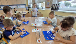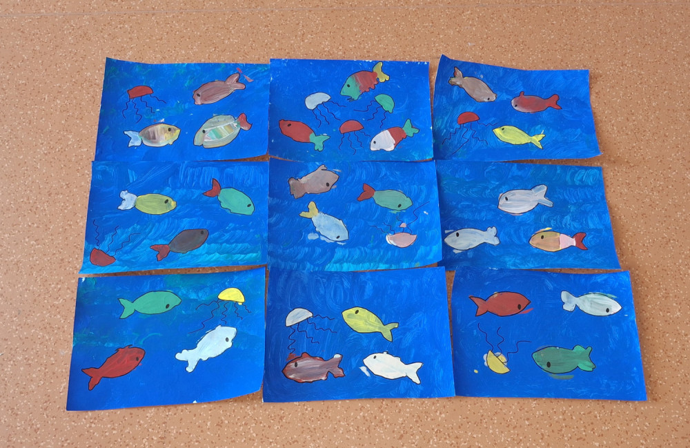 Společně malujeme krouživými pohyby moře. Procvičujeme si tak jemnou motoriku. Barevné rybky tvoříme přes  šablonu.