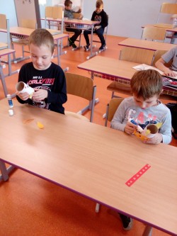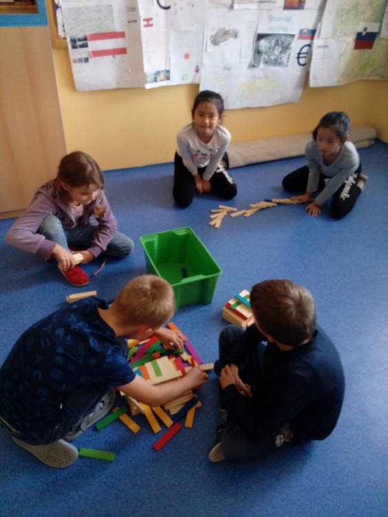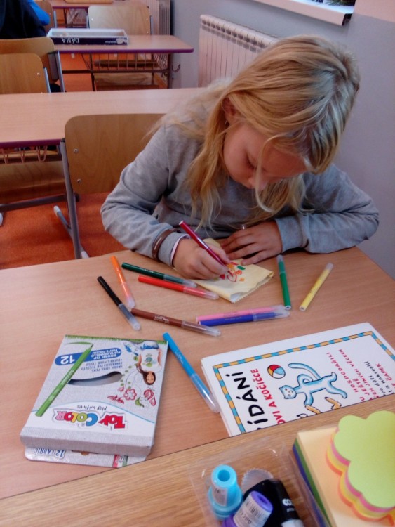 tvoření v odpolední družině malování na textilní pytlíky, puzzle, stavebnice dřevěné kostky