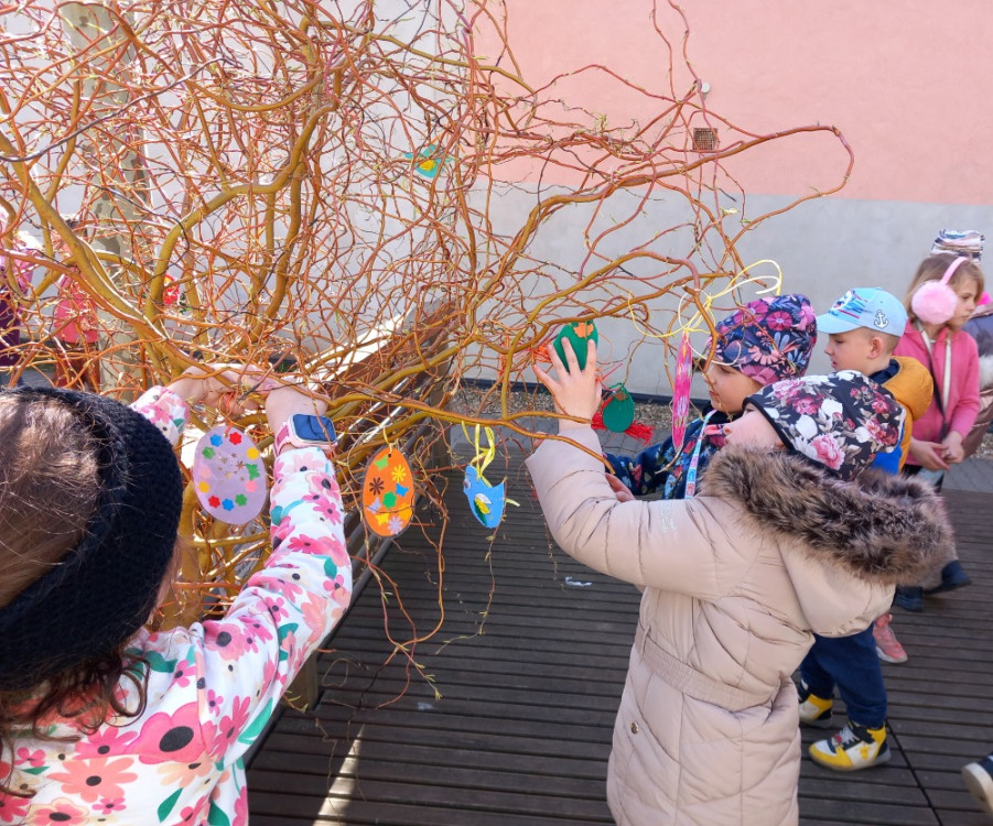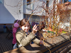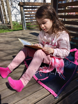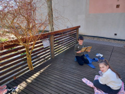 V rámci poobědového klidového režimu si čteme na terase u PBDS z knížky "Krysáci jsou zase spolu" a navazujeme tak ve čtení z loňského roku, kdy jsme si spolu s babičkou Jiřinkou četli z 1. dílu. Ve čtení se střídáme a docela nám to jde. Jedno odpoledne jsme pak navěsili na větve vrby a keřů naše ozdoby z barevných papírů, vlny a pěnovky, které se nám povedly.