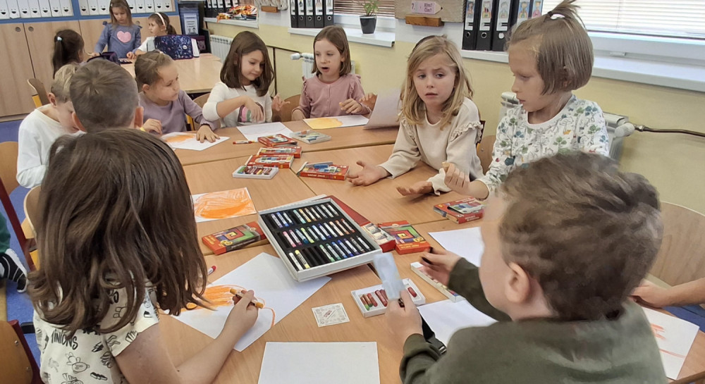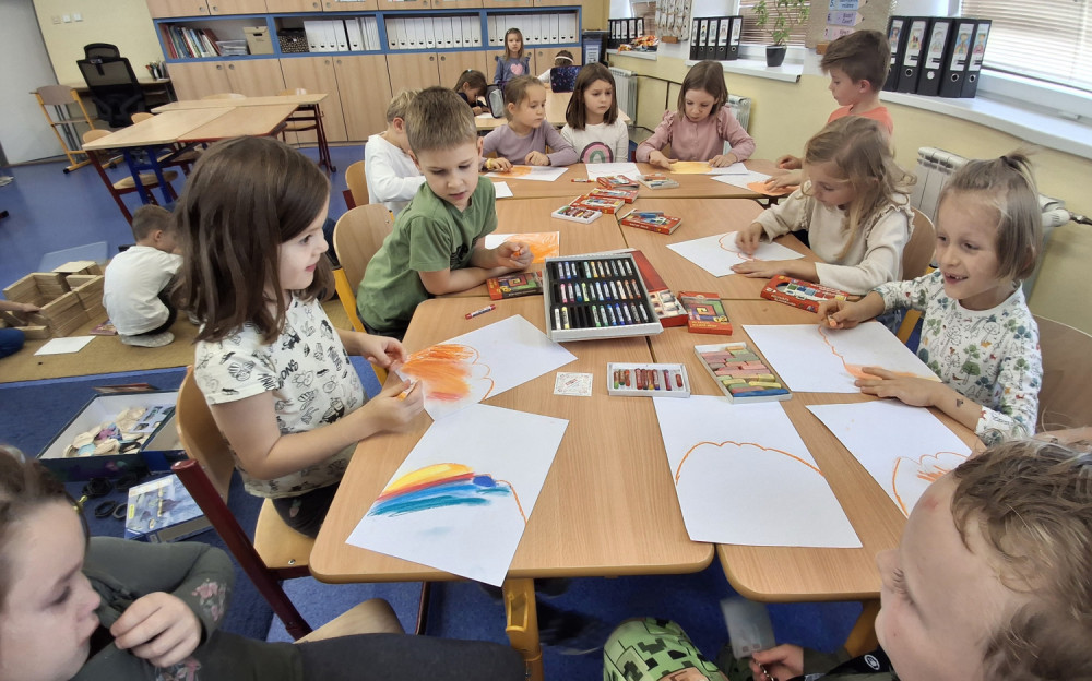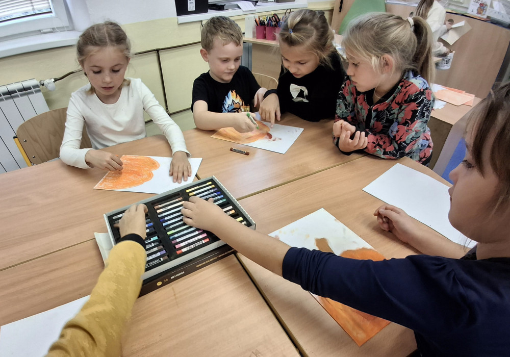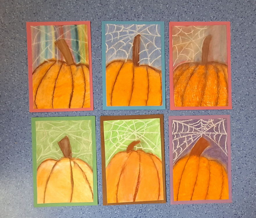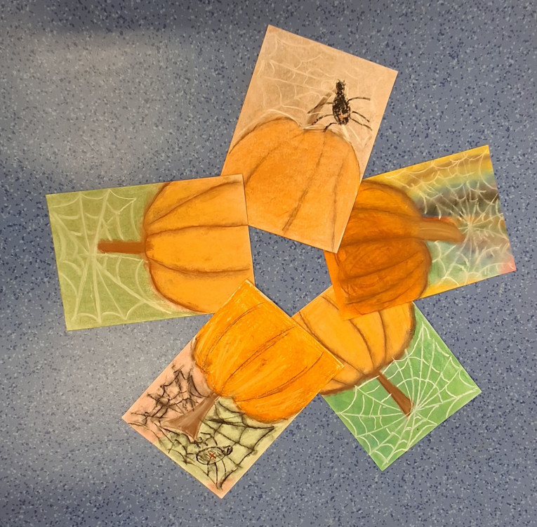 16. 10. 2025 Tvoříme dýně, které jsou dalším symbolem podzimu. Používáme olejové barevné křídy, kterými stínujeme tvar dýně a celé pozadí. Celý obraz doplníme jemnou bílou pavučinkou. Práce nás bavila a výsledek uvidíte ve fotogalerii.🙂 16 / 10 / 2025 SkS