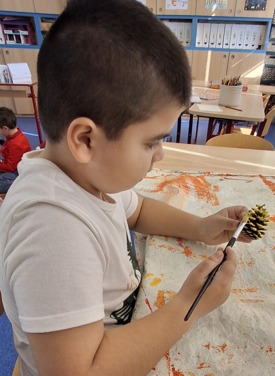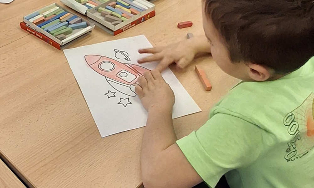 Hurá jarooo!🙂. Jarní kuřátko bylo tématem našeho společného tvoření. Žlutou temperovou barvou jsme natřeli šišku a polystyrenovou malou kouli, která se použila na hlavičku kuřátka. Obojí, včetně dalších doplňků jsem dětem slepila tavnou pistolí a kuřátko je na světě 🙂. Současně jsme se zapojili do tvoření vesmírné dekorace pro budoucí prvňáčky.