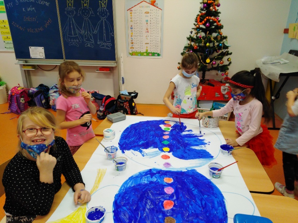 Než nám napadl sníh, namalovali jsme si na venkovní plakát sněhuláka.