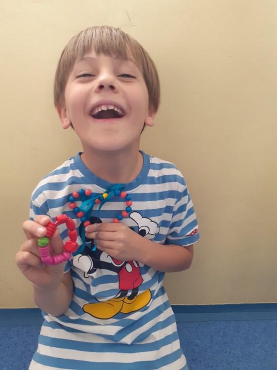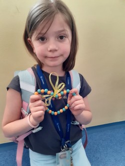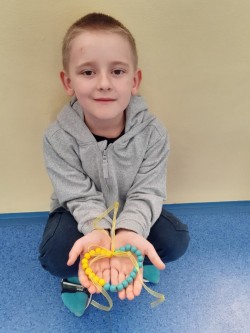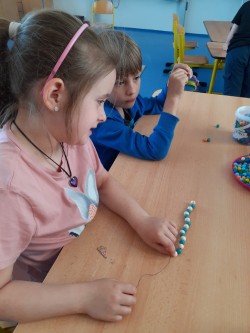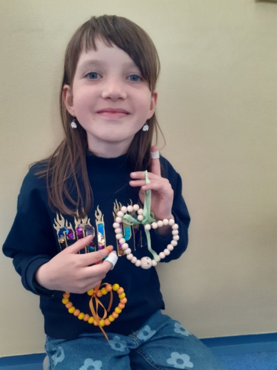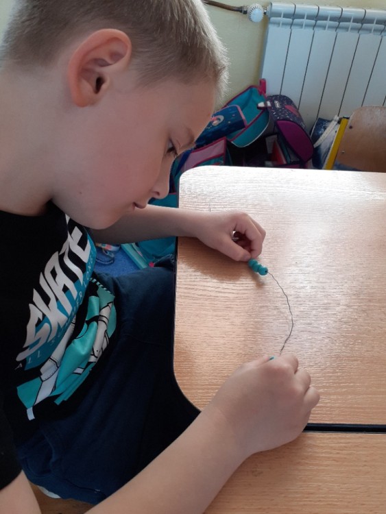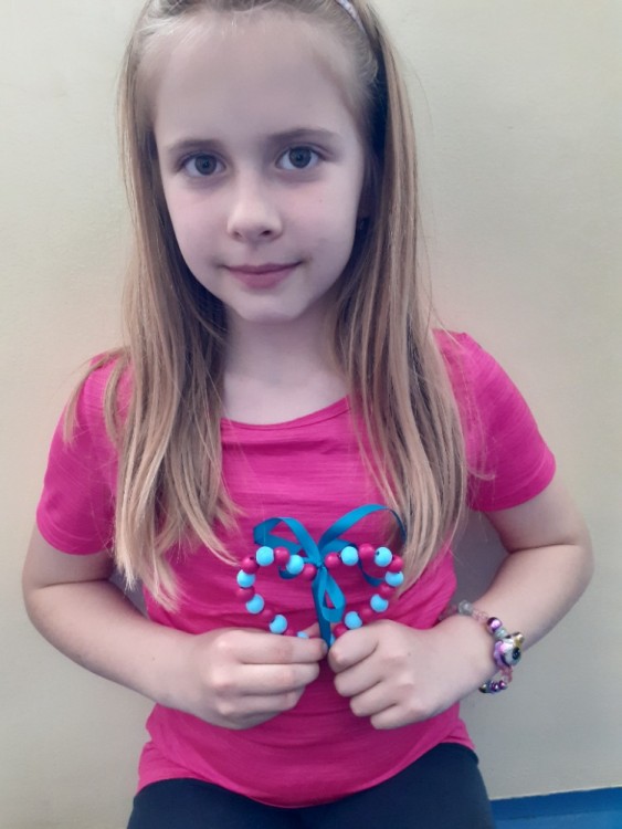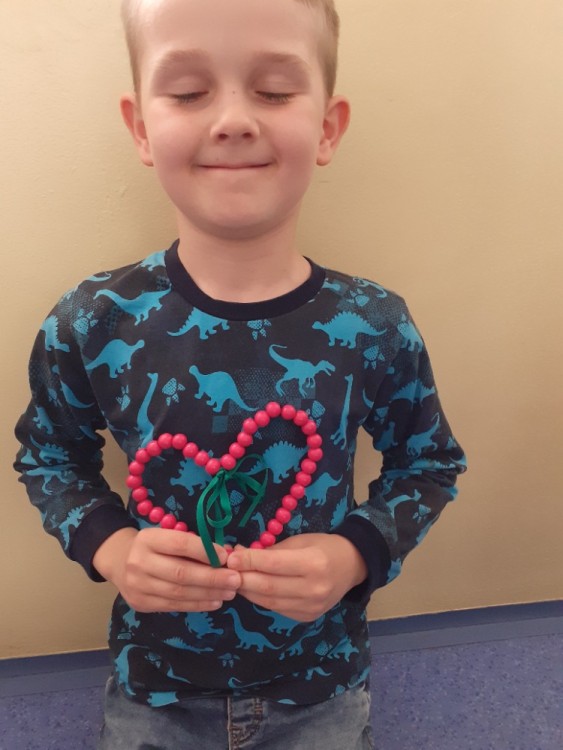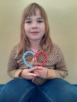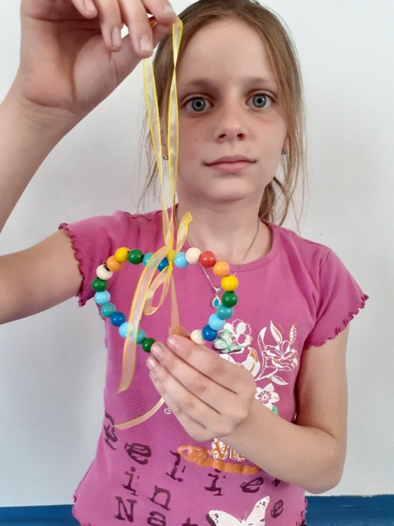 Korálky navlékáme na drátek,  tvarujeme srdce, na ozdobu uvážeme barevnou stuhu na mašličku.