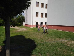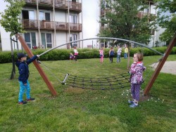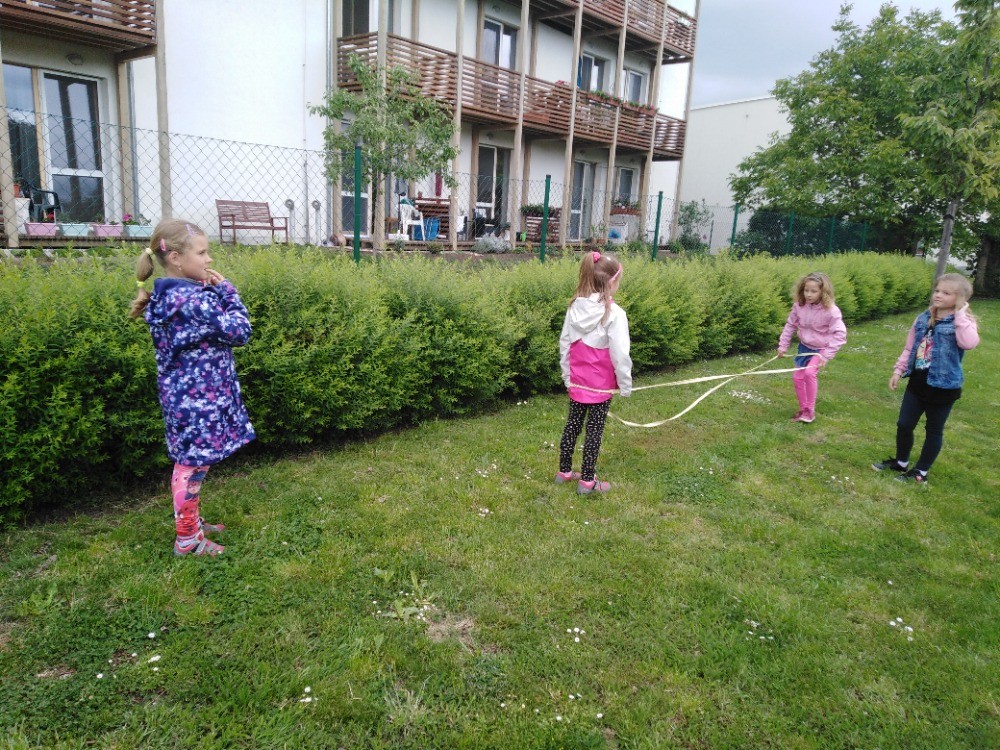 na zahradě školy, která se nám pěkně zazelenala. Skákali jsme přes gumu,