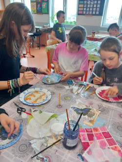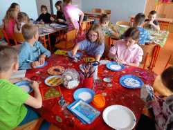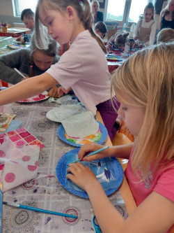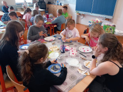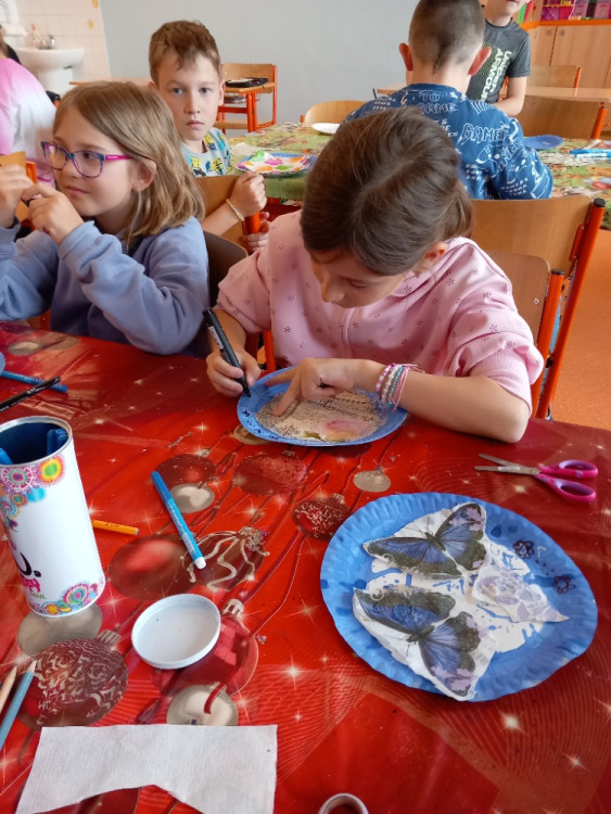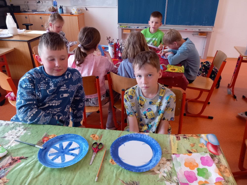 5. 6. 2025 Z kulatých papírových tácků tvoříme hodiny jako dekoraci nebo pomůcku, abychom se naučili správně určit čas. Ve tvoření nám pomáhaly studentky Agáta a Katka. Pracovali jsme s inkoustem, zmizíkem a ubrousky. 5 / 6 / 2025 BJ