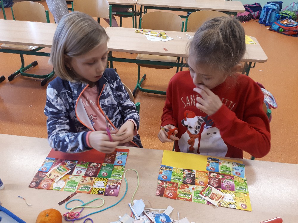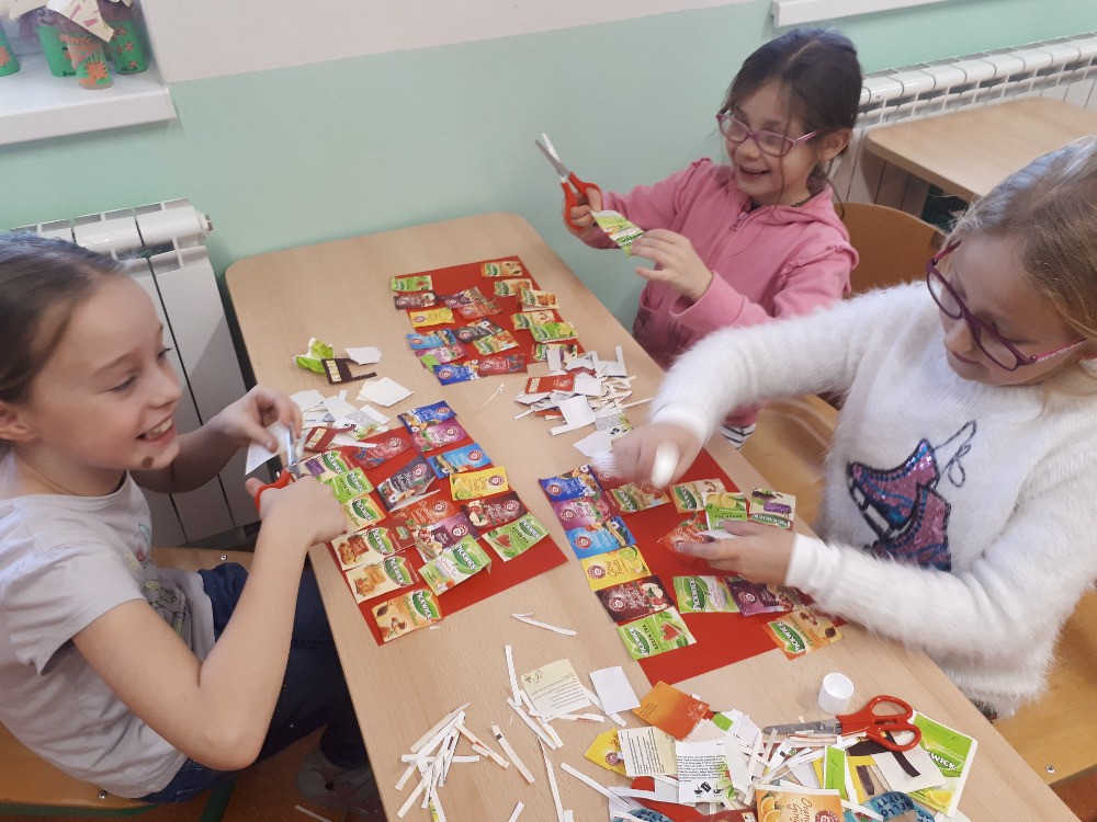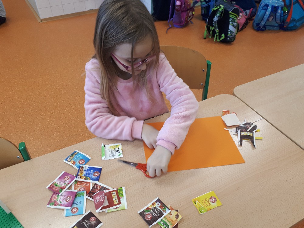 Vyrábíme podložky z tvrdého papíru, zdobíme čajovými sáčky a laminujeme, 4.odd., L.Š.