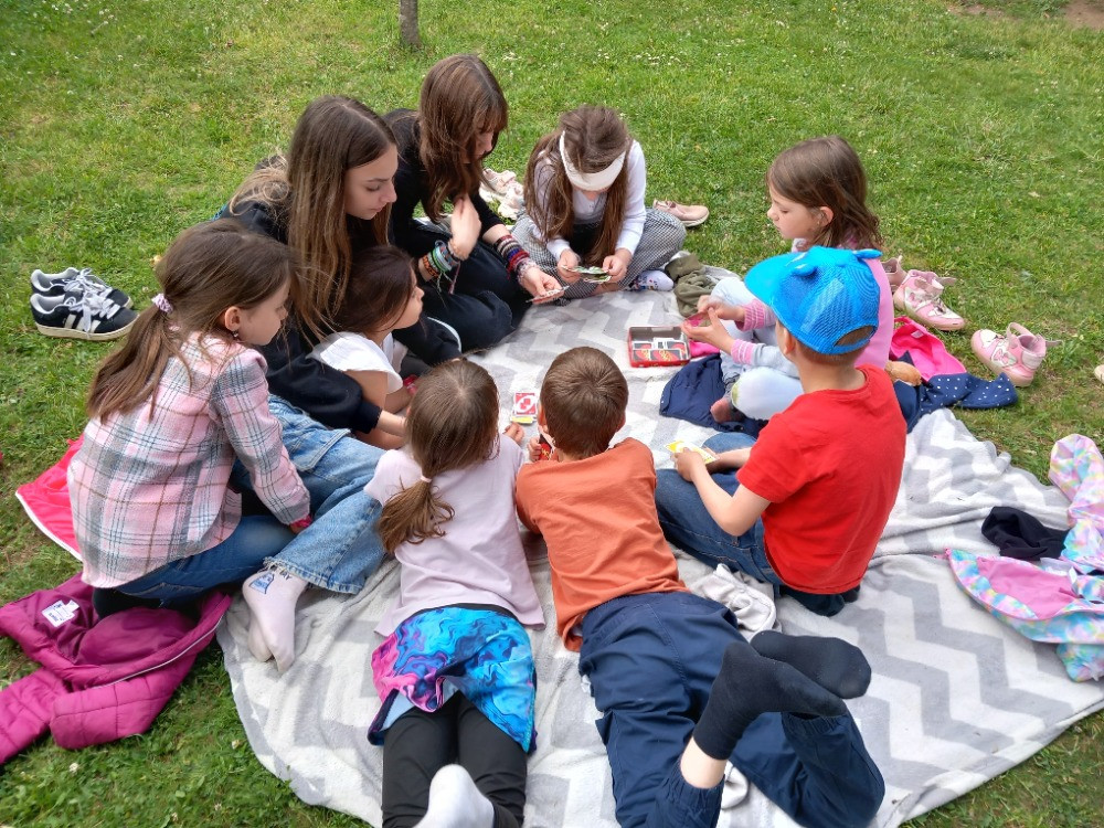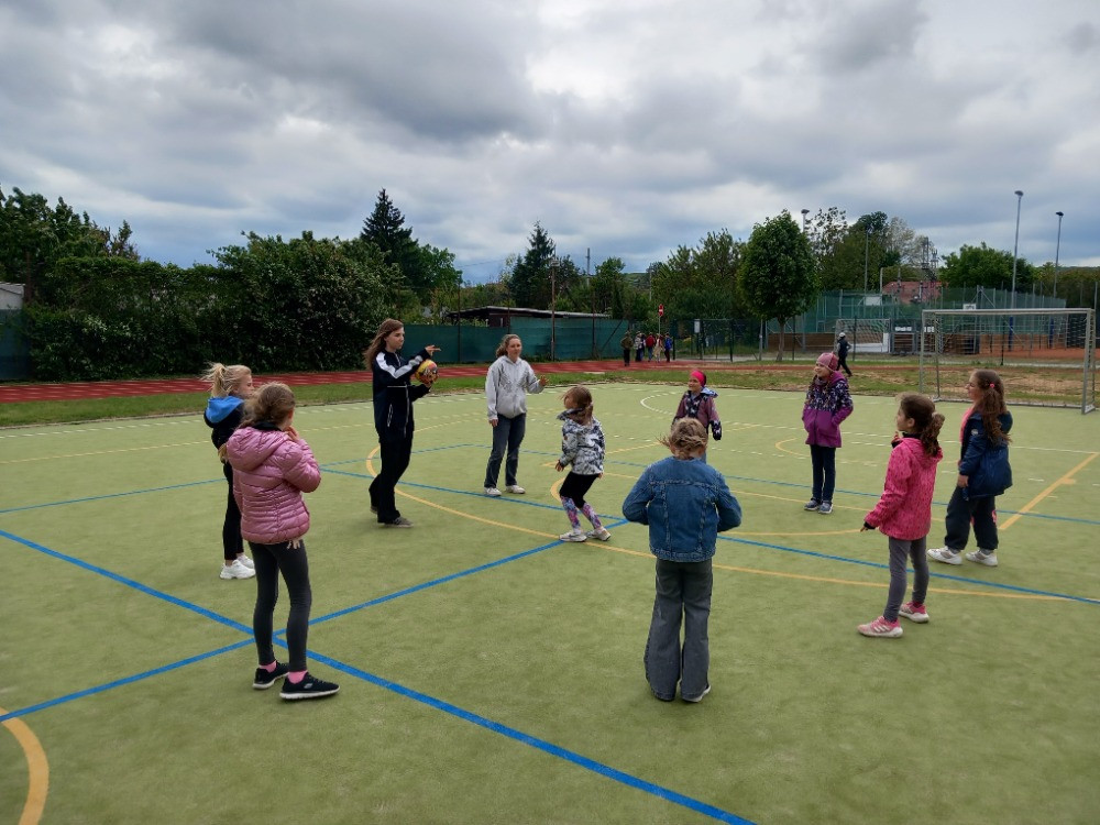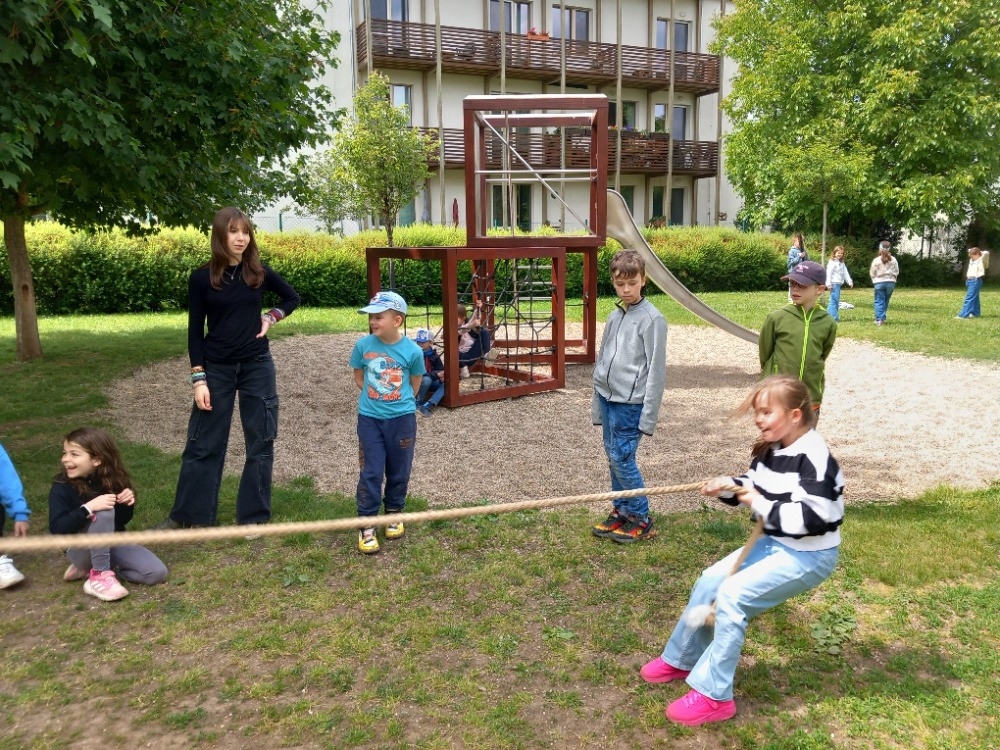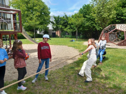 Koncem května byly v našem oddělení na pedagogické praxi dvě studentky, Agáta a Katka. Zasportovali jsme si s nimi na školním hřišti i zahradě. Hrály jsme vybíjenou, na Prostředníka a přetahovali jsme se s lanem. Společný čas jsme si s nimi moc hezky užili.