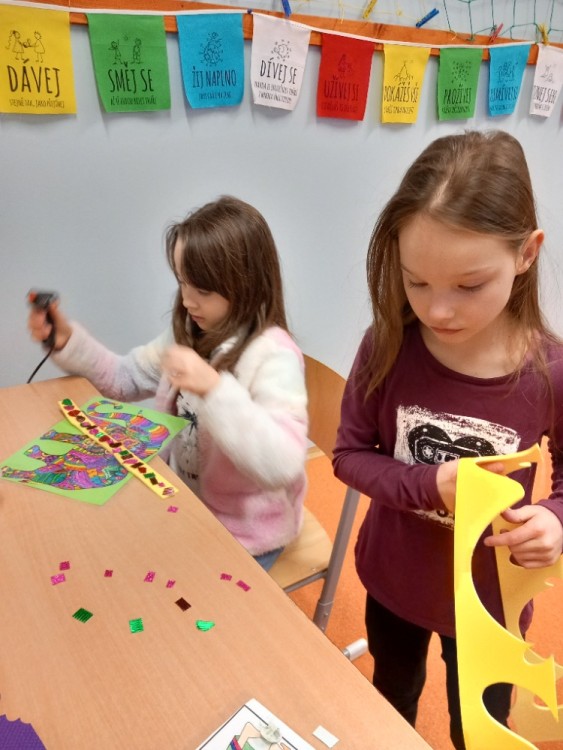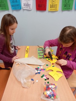 Ze zbytků pěnovky a vlnité lepenky tvoříme pomocí tavné pistole tříkrálové koruny. Rádi spolu hrajeme stolní hry, Piškvorky, kvarteta, Černého Petra. Naší oblíbenou stavebnicí je Lego, ze kterého skládáme auta, letadla, lodě a tím si procvičujeme jemnou motoriku.