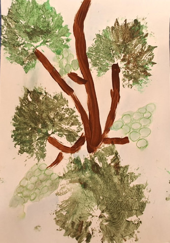 V tomto období zraje vinná réva a její větev i s plody malujeme. Listy natíráme temperovou barvou a opatrně přikládáme na tvrdý bílý karton, aby vynikly co nejvíce jejich detaily. Hnědou barvou tvoříme větev, kterou doplníme plody. Máme hotovo a je čas si hrát🙂.