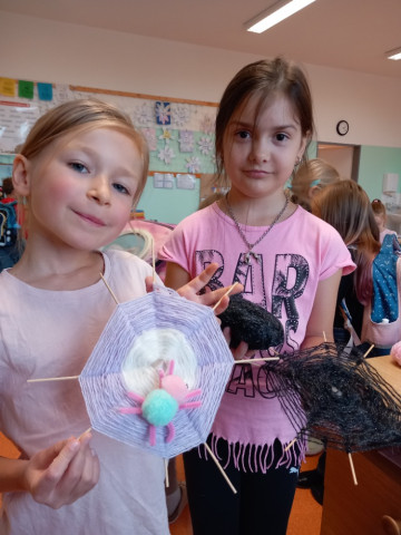 Na konci září jsme se dali do tvoření pavučin ze špejlí a vlny. Z kaštanů jsme s pomocí vrtáků dělali zvířátka. Z chlupatých kuliček a drátků jsme lepili tavnou pistolí pavouky. Někteří z nás pracovali s tavnou pistolí a vrtákem poprvé, ale zvládli jsme to a tvoření nás moc bavilo.