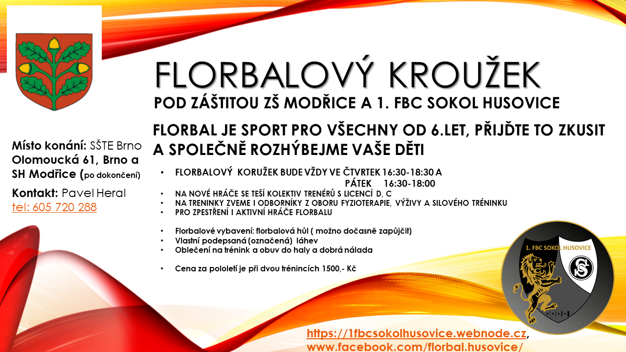 pod záštitou ZŠ Modřice a 1. FBC Sokol Husovice - florbal je sport pro všechny od 6.let