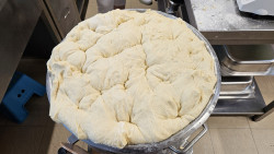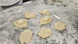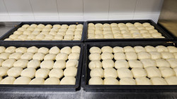 Probíhá příprava a chystání potravin. Paní kuchařky zadělávají těsto z 50-ti kilo mouky. Takové množství musí zadělávat na třikrát. Do náplně přijde 30 kilo tvarohu, který se ochutí a následně plní.