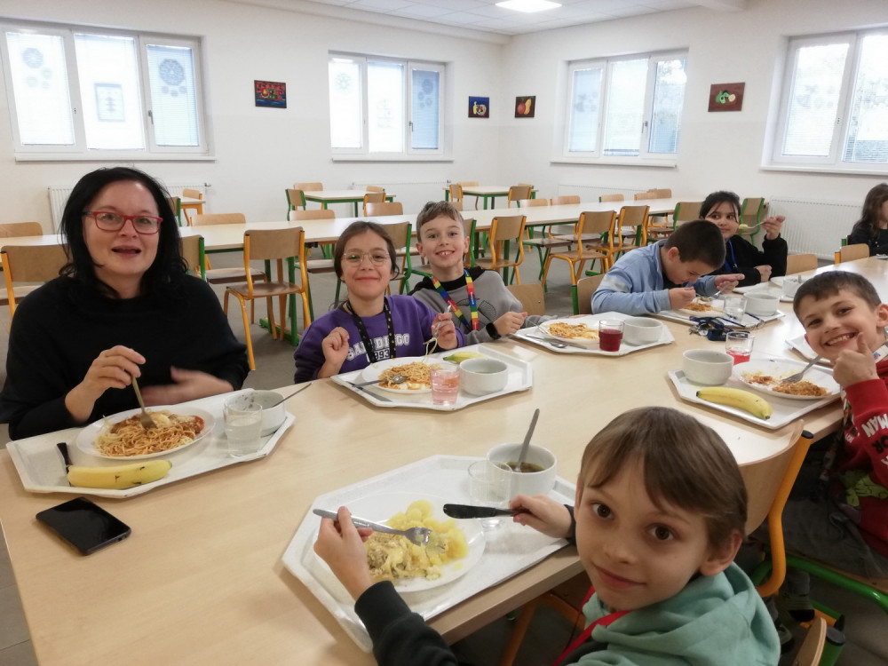 Řekněme si to upřímně: co bychom si bez školní jídelny počali? Po hodinách a hodinách krutého učení jednomu pořádně vyhládne, a tak s posledním zvoněním radostně běží (ač se to nesmí) do jídelny, kde už to nádherně voní. Ale to už všichni ví předem, protože to většinou voní od rána po celé škole. Naše paní kuchařky totiž vůbec nelelkují, ale od časného rána nám strojí hostinu. A že školní jídla chutnají výtečně, dosvědčí mlsouni s talířem, kteří si pravidelně chodí přidávat.