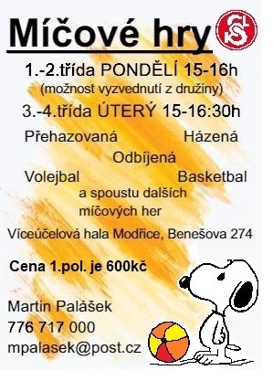 od úterý 7. 9. 2021 bude zahájen kroužek míčových her pro děti 3.- 4. tříd, 15h - 16:30 hodin