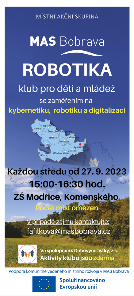 Robotika bude probíhat ve středu od 15:00 do 16:30 hod. na budově ZŠ Benešova