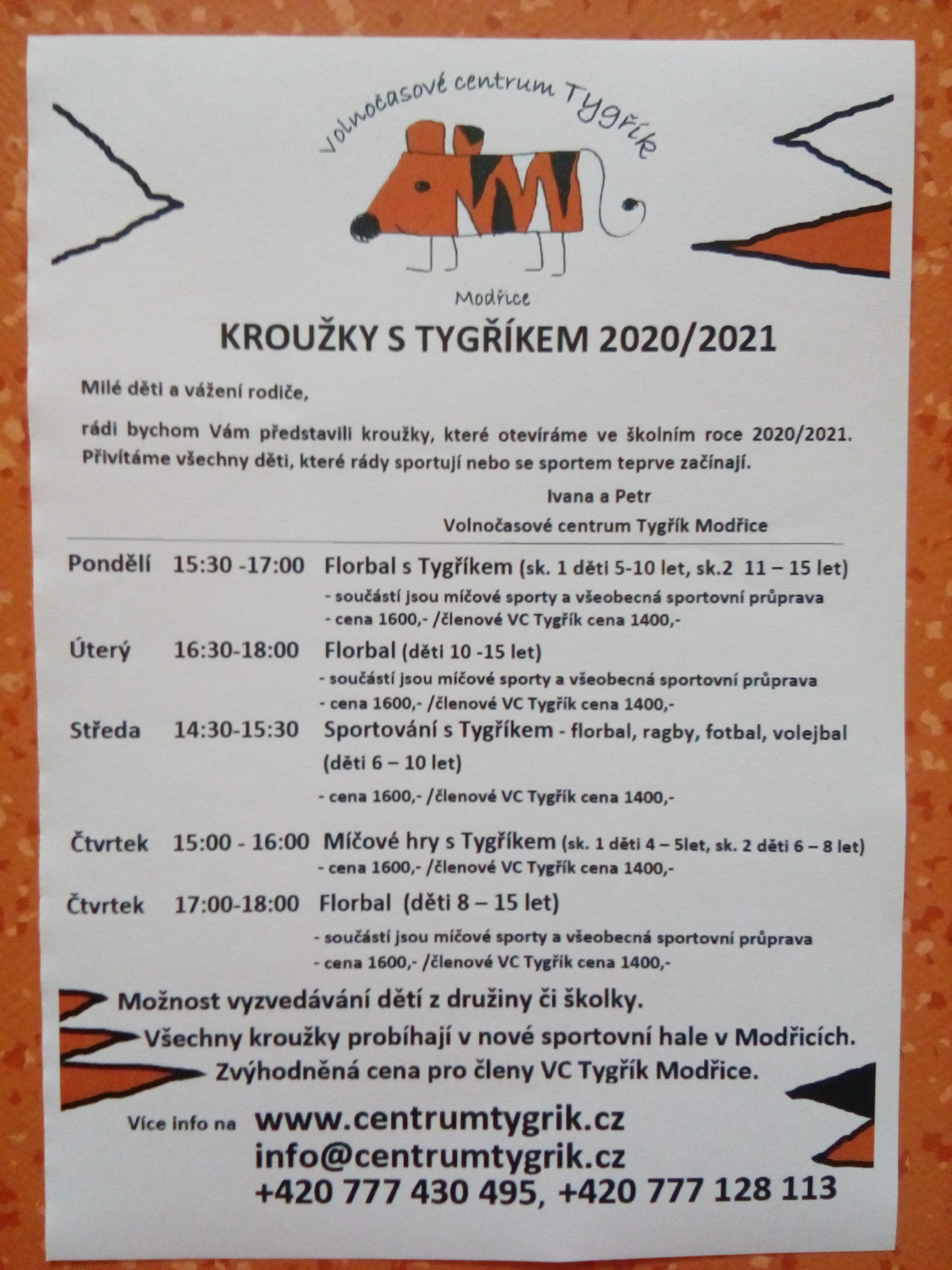 - Všechny kroužky probíhají v nové sportovní hale v Modřicích. Více info. na www.centrumtygrik.cz info@centrumtygrik.cz +420 777 430 495, +420 777 128 113