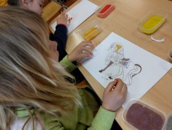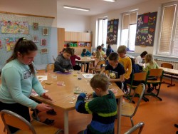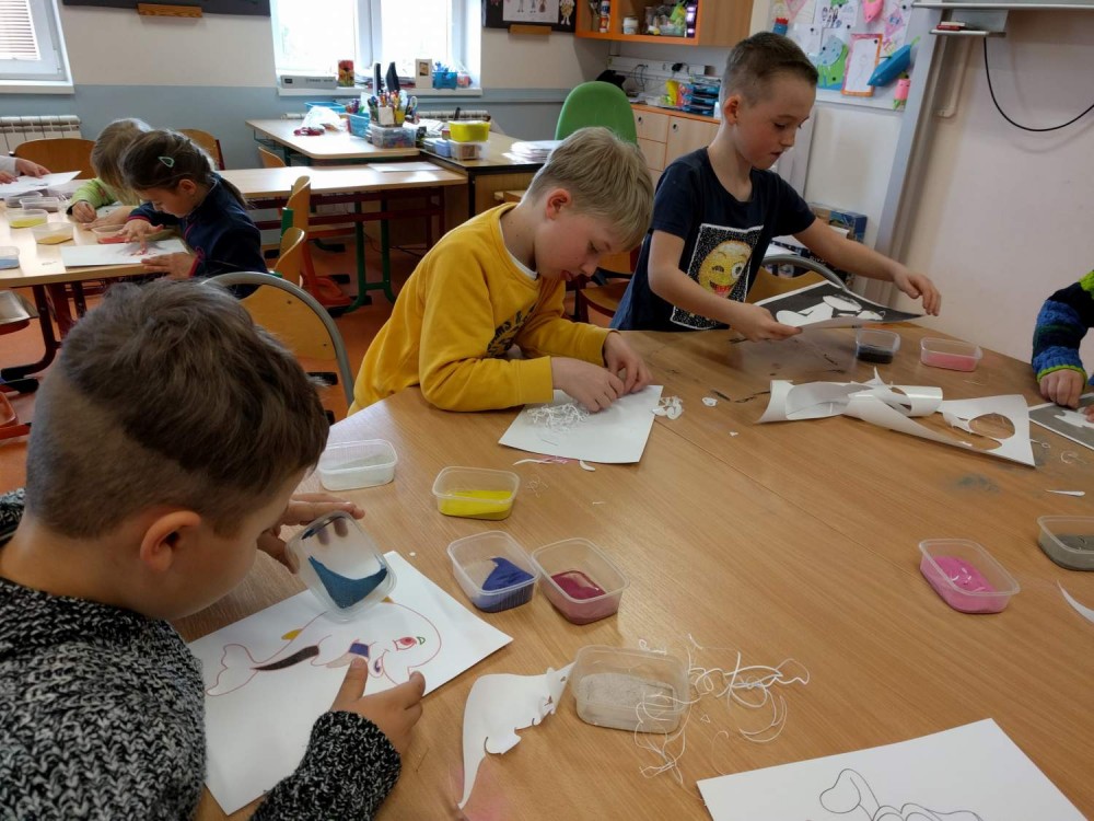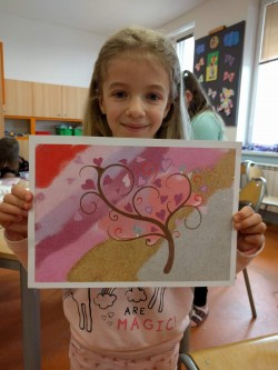 Dnes jsme měli možnost zopakovat si výtvarnou techniku, kterou jsme si vyzkoušeli při vánočním tvořeni - pískování, vlastně takové omalovávání obrázku pomocí barevných písků.Moc jsme se těšili, protože nás tato výtvarná technika baví.Tvořili jsme se zaujetím a obrázky se nám moc povedly.