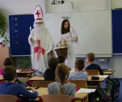 Atmosféra první prosincové středy na prvním stupni modřické školy připomínala včelí úl. Všeobecné vzrušení, lehké obavy a očekávání něčeho výjimečného bylo cítit z každého zákoutí. Bylo 5. prosince a děti už dobře věděly, že přijde Mikuláš v nebeské a pekelné společnosti. Takže když se na chodbách ozvalo první zařinčení řetězů a dupot čertích kopyt, v dětských dušičkách se začaly mísit pocity strachu a touhy. Ti malincí zpytovali svědomí, jestli jim jejich letošní hříchy Mikuláš odpustí a ti větší, lehce pubertální přemýšleli, jak vyzrát na čerty a zároveň urvat kousek slávy pro sebe. Všichni společně se ale moc těšili na mikulášskou nadílku.