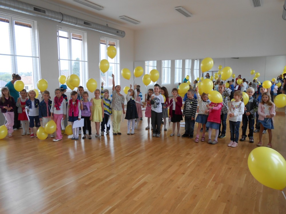 Tady jsme měli možnost i my, zástupci rodičů ze SRPŠ děti přivítat, představit se jim a potěšit je malými dárečky. Záplava žlutých nafukovacích balónků a rozzářených párů oček byla okouzlující. Navíc děcka dostaly žluté odznáčky s názvem školy, to aby bylo všem jasné, že jsou modřičáci :-)