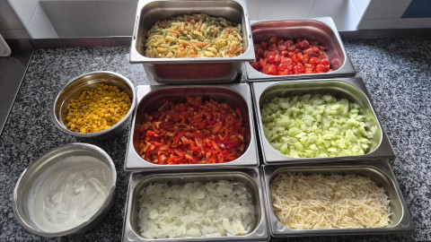 Dětem jsme nachystali těstovinový salát, který si mohly sestavit dle své chuti.  Na výběr měly různé druhy zeleniny, těstoviny a jogurtový dresink.  Některé kombinace i velikosti porce nás překvapily.  Děti byly velmi šikovné -   vše snědly a některé si přišly i přidat.