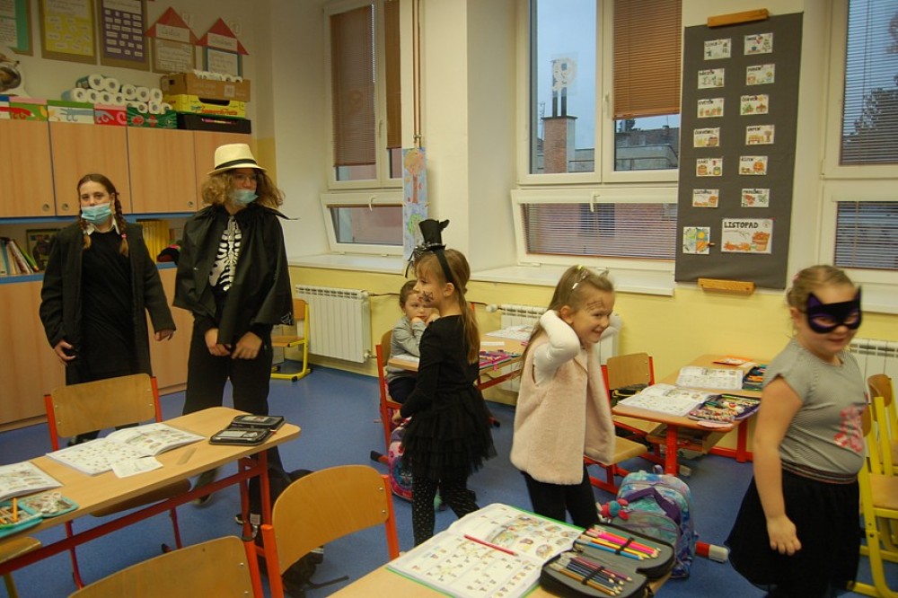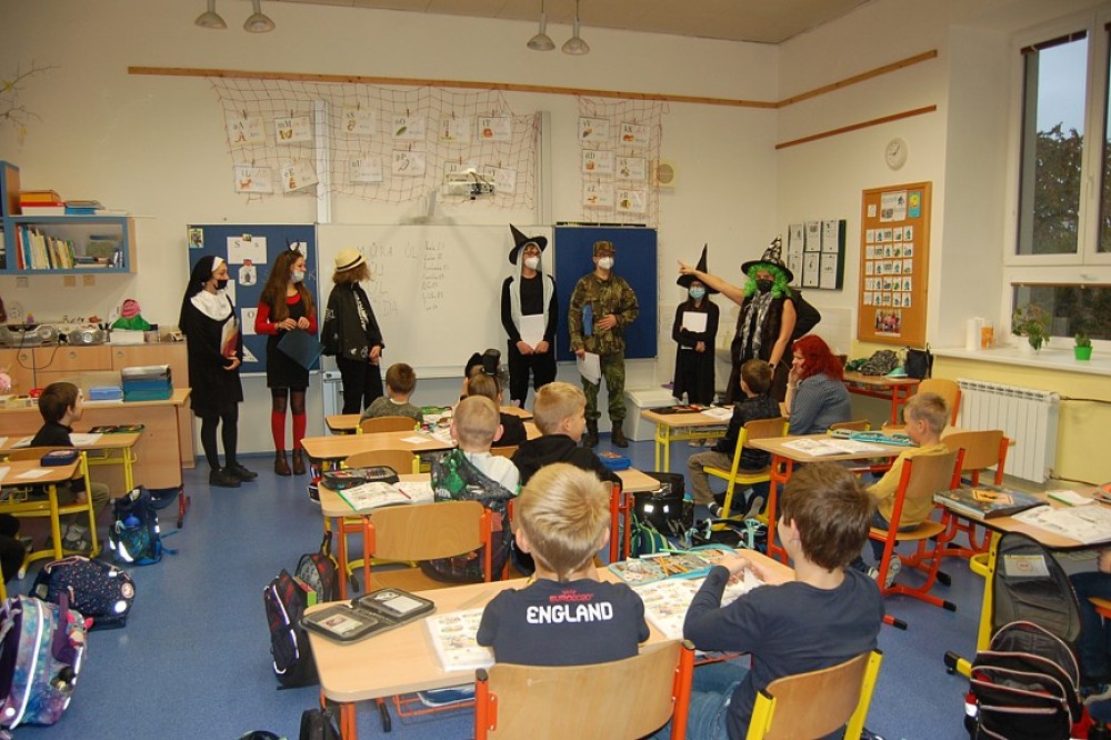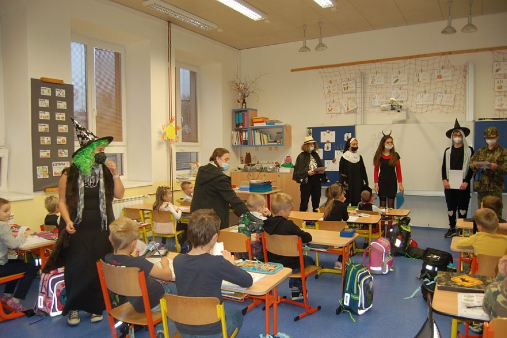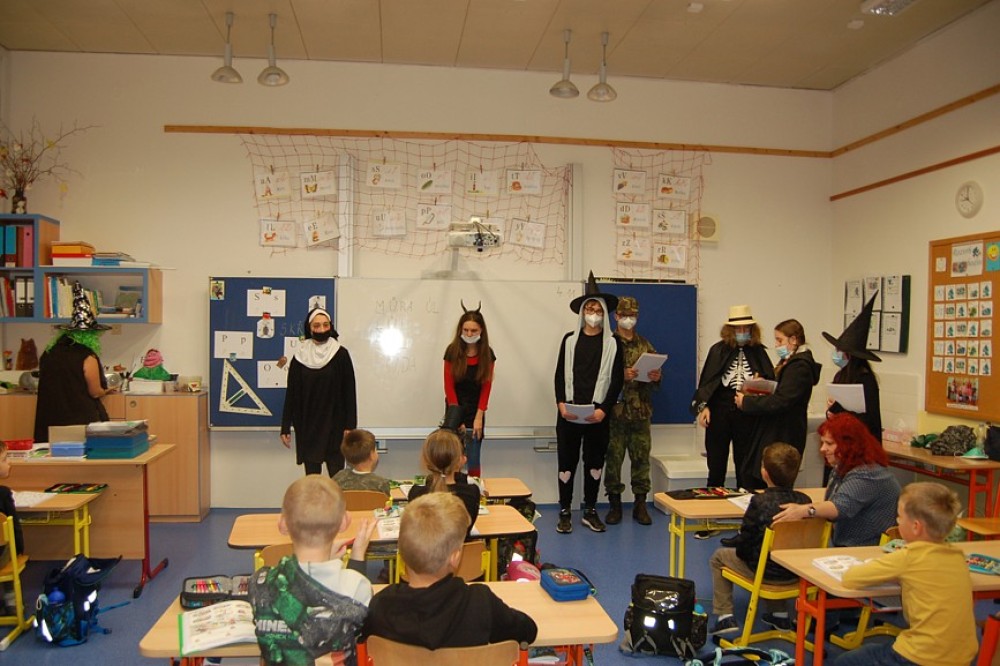 4. 11. 2021 Dnes jsme si připomněli Halloween. Děti mohly přijít v kostýmu a žáci 2. stupně - vybraní zástupci parlamentu, který tuto aktivitu připravil, přišli, aby kostýmy obodovali. Výherci dostali pozvánku na vánoční dílničky s žáky 2.stupně. 10 / 11 / 2021 JS