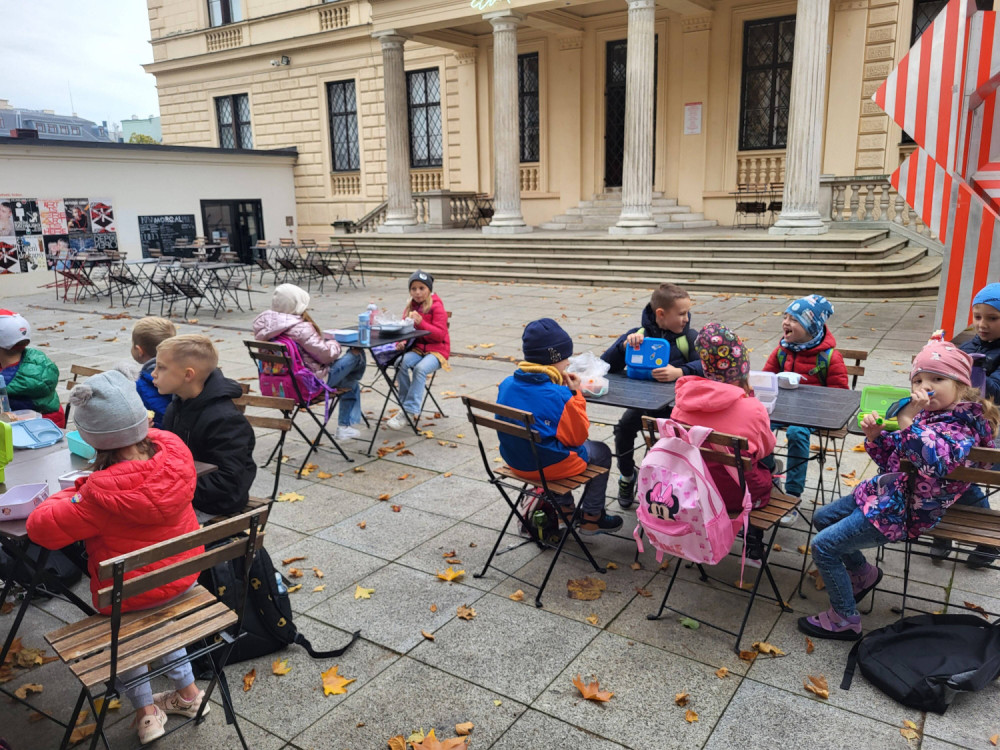 Cesta vlakem byla pro některé žáky prvním seznámením s touto dopravou. A co teprve pěší cesta s pojmenováváním ulic, kostelů, radnic, náměstí, divadla a muzeí... Cestou nám patřičně vyhládlo, tak jsme museli doplnit energii. Venku dobře chutnalo. A pak hurá do Besedního domu.