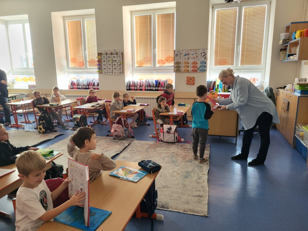 Paní ředitelce moc děkujeme za milou návštěvu a podporu. Těšíme se, až jí brzy ukážeme, jak se z nás stávají ještě pilnější a zdatnější čtenáři.