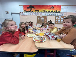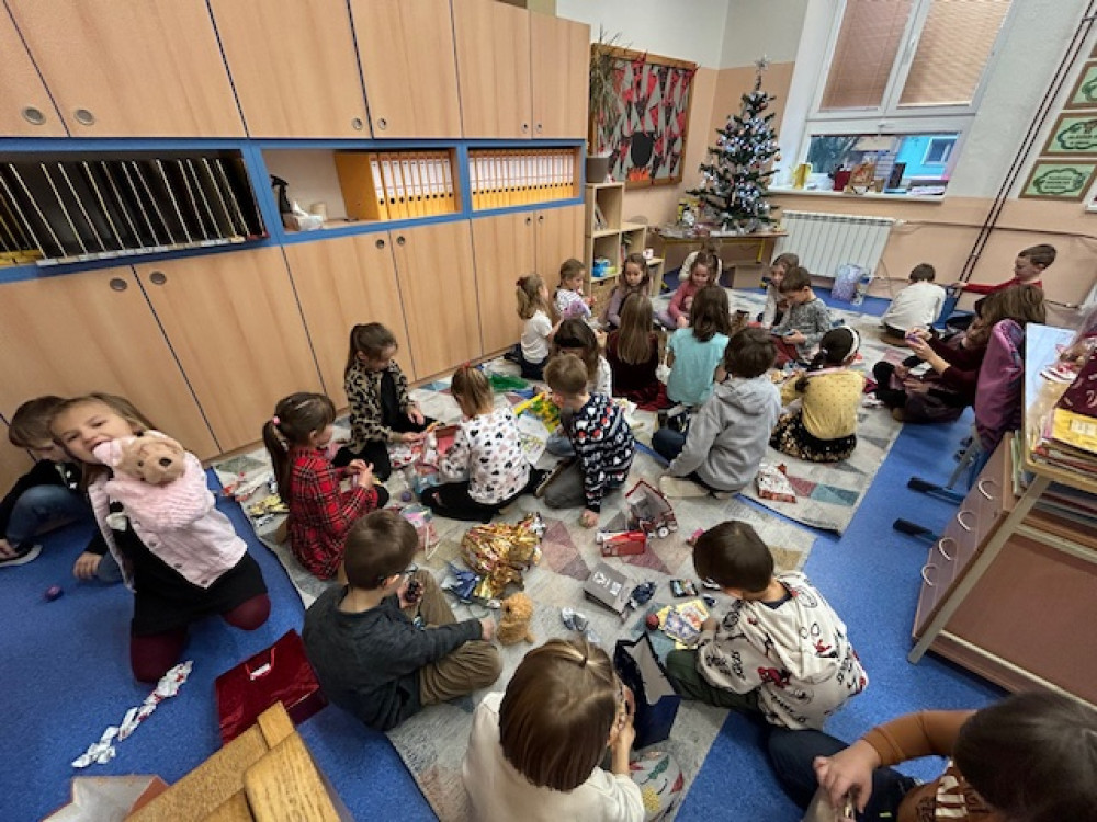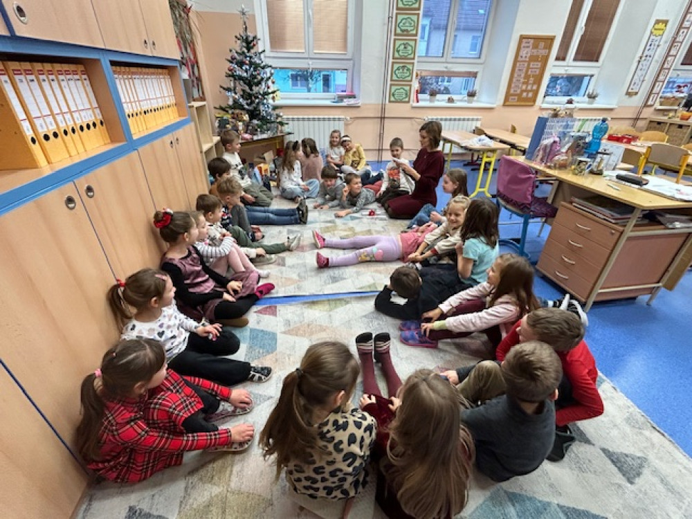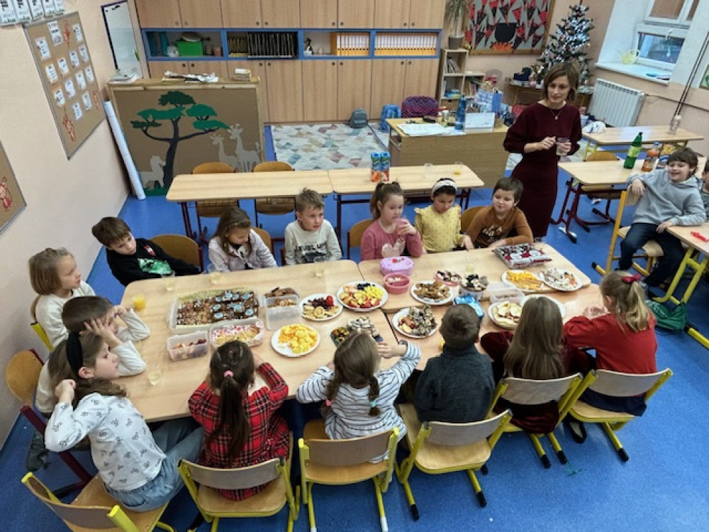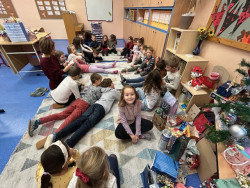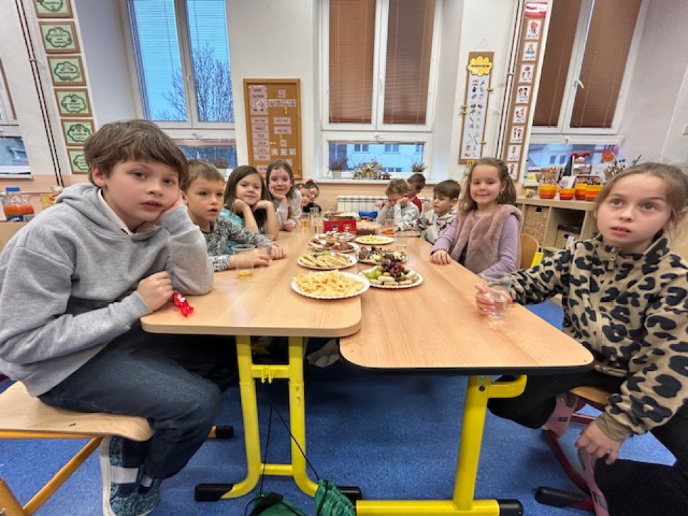 Poslední školní den před Vánocemi jsme si v naší třídě udělali opravdu štědrý. Ná začátku děti vyrobily krásná vánoční přání a poté jsme začali chystat slavnostní tabuli - sešlo se spousta jídla (nechybělo cukroví, ovoce, slané dobroty,...) i pití a děti hodovaly prakticky celé dopoledne a později i v družině... Po občertvení jsme konečně přešli k vytouženému stromečku obloženému dárky. Zazpívali jsme koledu, zapálili prskavky (pod hasičským dohledem) a mohlo se nadělovat. Všichni nadšeně rozbalovali dárečky, ze kterých měli velkou radost. Pod stromečkem našli i nové hry, na které si vydělali prodejem svých výrobků na jarmarku. Do konce vyučování si už jen chvilku pohráli a hurá na vánoční prázdniny:-)...