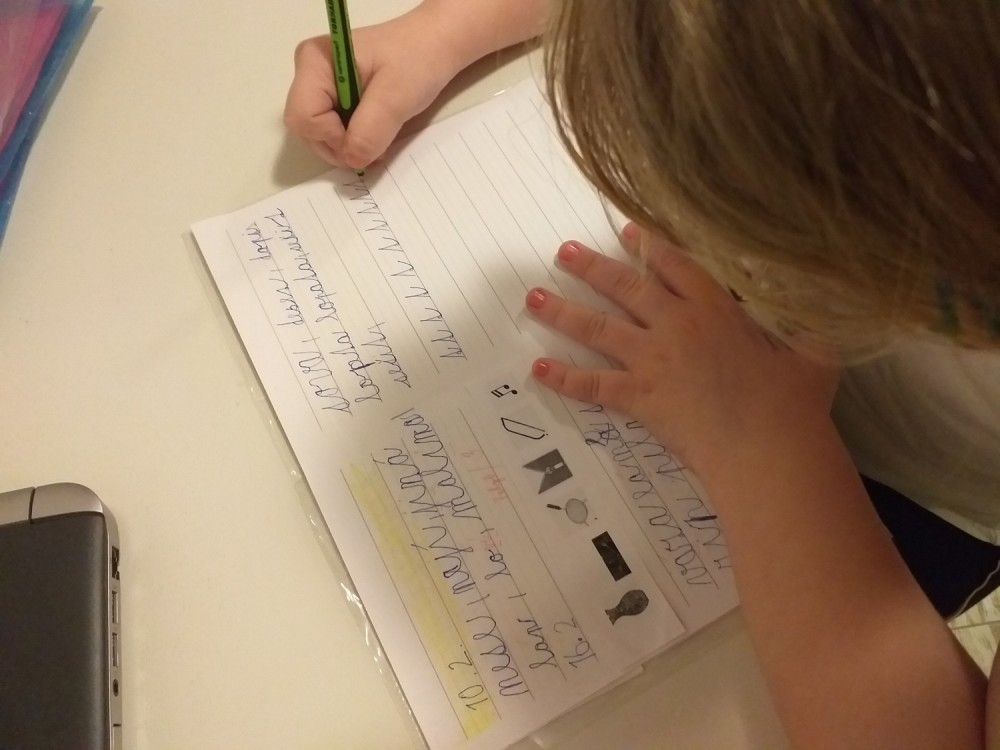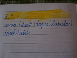 I v probíhající distanční výuce nezapomínáme procvičovat psaní, které si ověřujeme třeba obrázkovým diktátem. Jako tabuli jsme použili jamboard a podle obrázků jsme napsali šest slov. Kdo ještě některé písmenko úplně neovládá, řádně si je docvičuje, stejně jako ve třídě.