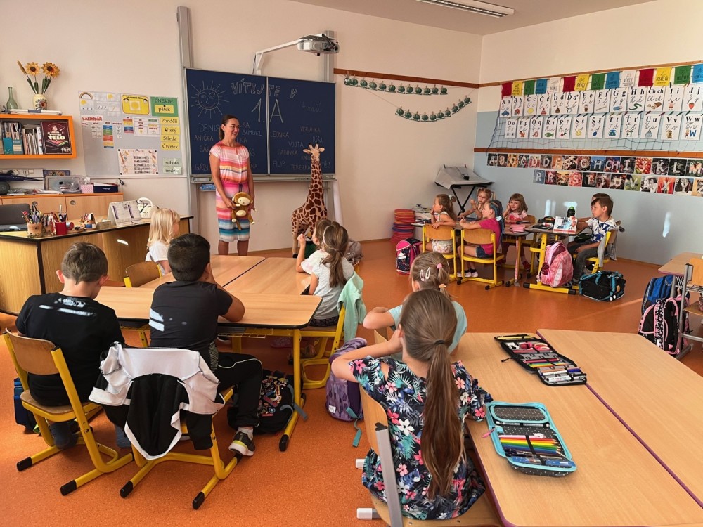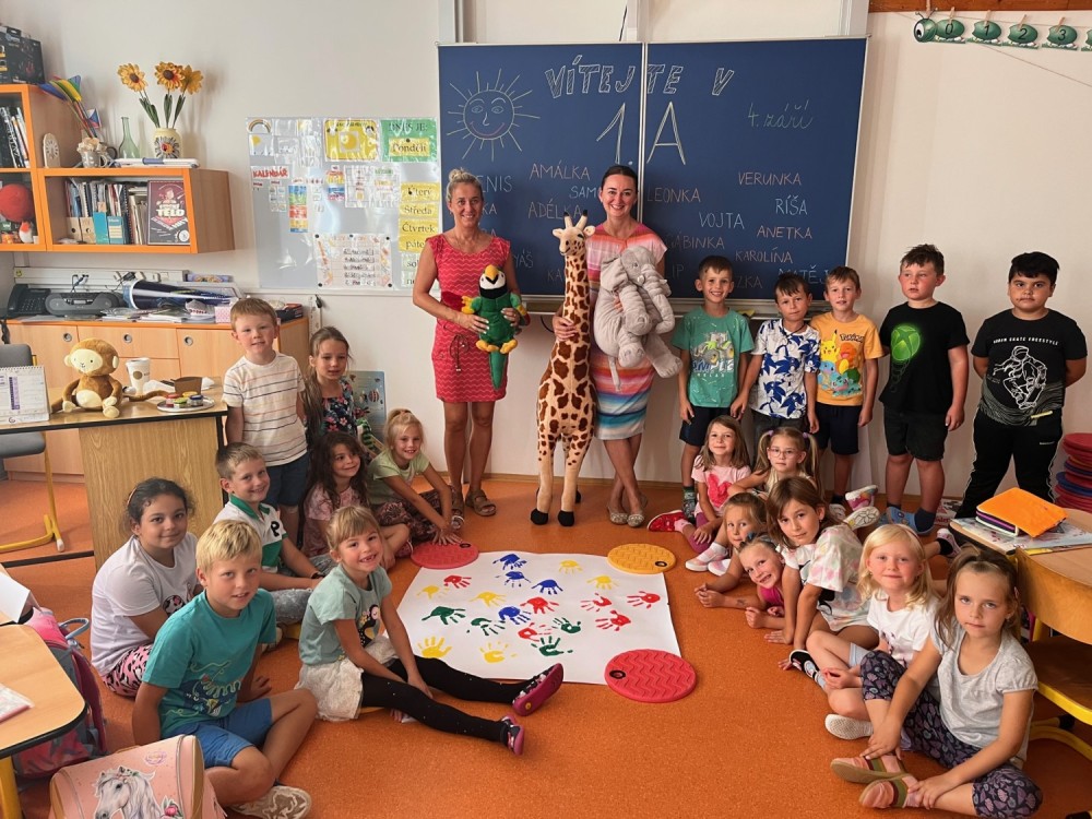 Dnes jsme zažili dopolední vyučování trochu jinak. Seznámili jsme se s paní psycholožkou, která nám připravila spoustu aktivit. Nejprve jsem se snažili oslovovat spolužáky jménem v kroužku při házecí hře, pak jsme si připomněli pravidla třídy. Ta jsme stvrdili svým "podpisem" - vytvořili jsme vlajku složenou z obtisků našich rukou. Také jsme si zatančili a při tom poznávali a zjišťovali něco nového o kamarádech. Abychom poznali lépe i školní budovu, měli jsme za úkol najít v každém patře ztracenou blešku. Na závěr nechyběly ani hry v družstvech na chodbě.