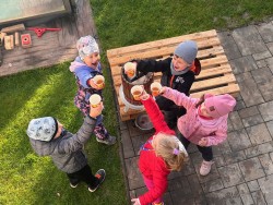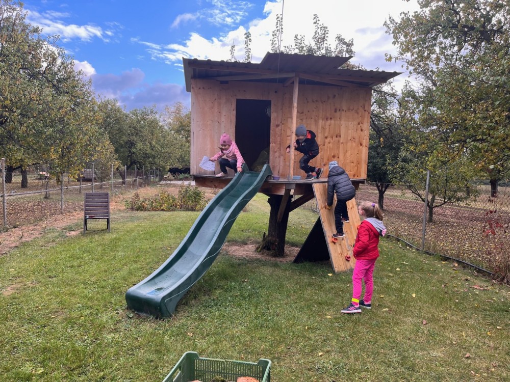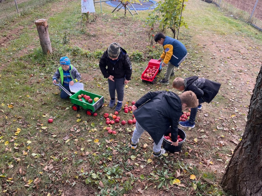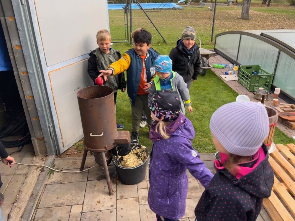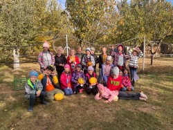 Před prázdninami jsme se společně vydali na zahradu k mamince jedné naší žačky - k paní Pelikánové. Spolu s dědečkem pro nás připravila dobrodružný program: na jednotlivých stanovištích jsme splnili úkol, za který jsme dostali razítko do karty. Krájeli jsme jablíčka na sušení, odvozili jsme jablka k dědečkovi, pod jeho dohledem jsme je vložili do drtiče a rozdrcená je přendali do lisu. Společnými silami jsme z jablek vylisovali šťávu, kterou nám paní Pelikánová na závěr nalila do lahví a směli jsme si ji odnést domů. Na dalších stanovištích jsme loupali ořechy, dlabali semínka slunečnic pro ptáčky, jako Jeníček a Mařenka jsme vydlabávali kukuřici nebo stavěli domeček pro podzimní vílu. Na závěr jsme si ve skupinkách připravili pro ostatní dýňové divadlo. Celé dopoledne jsme strávili na čerstvém vzduchu a příjemně unavení se vrátili na oběd do školy. Velké poděkování patří mamince - paní Pelikánové, která si pro nás tento program připravila! A prázdniny mohou začít :-).