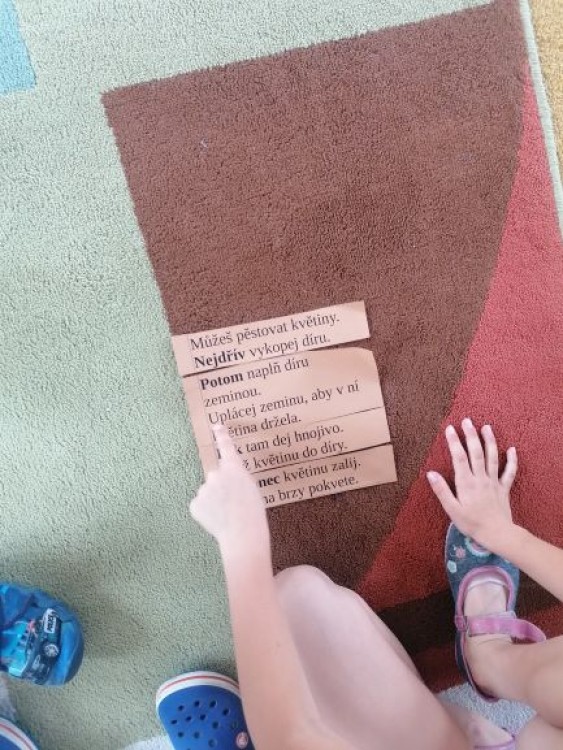 Od hlavní myšlenky textu, poučení, dramatizace a hodnocení chování hlavního hrdiny jsme postupně došli k určování časové a dějové posloupnosti. Příběh jsme skládali nejdříve ve skupinách, později samostatně. Učili jsme se v textu identifikovat signální slova, která nám při sestavování příběhu z částí pomohou.