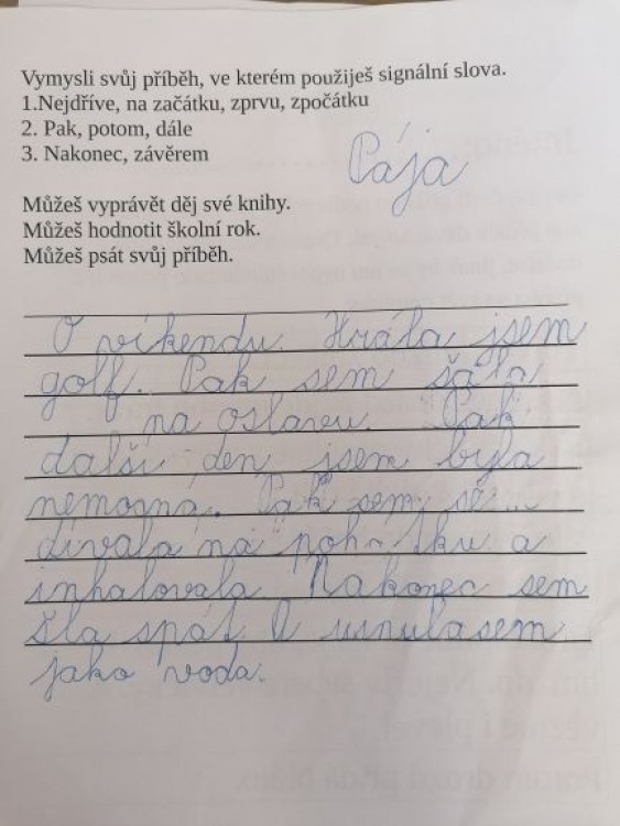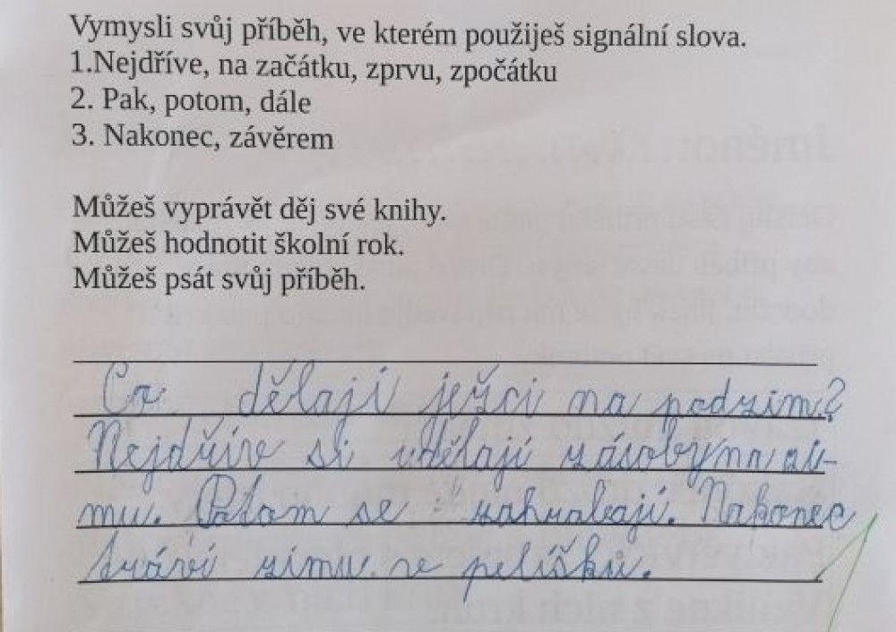 Nejvyšší metou byla tvorba vlastního textu, který obsahuje signální slova. Práce některých dětí jsou skvělé, proto se o radost z prací chceme s vámi podělit.