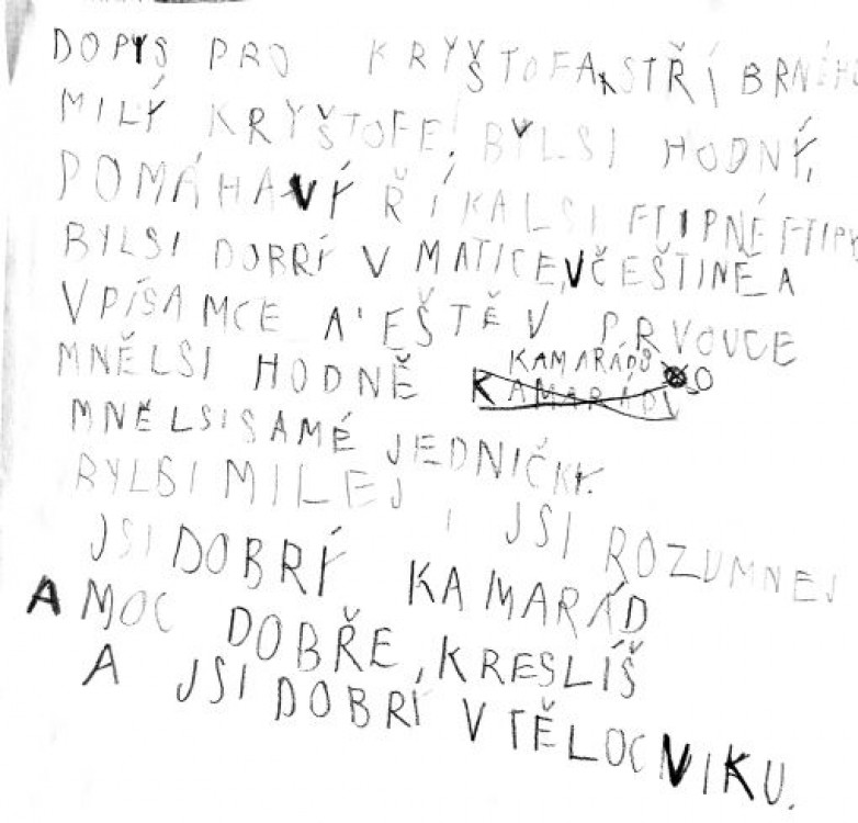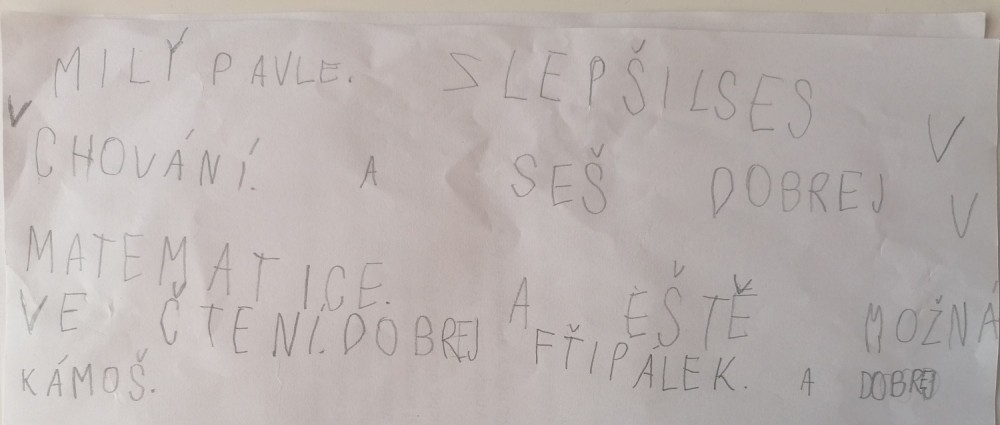 Kdo si myslí, že prvňáci jsou na to malí, mýlí se. V dnešní hodině čtení/psaní vznikaly dopisy adresované SOBĚ. Je těžké přemýšlet sám o sobě, lépe se přece hodnotí druzí...