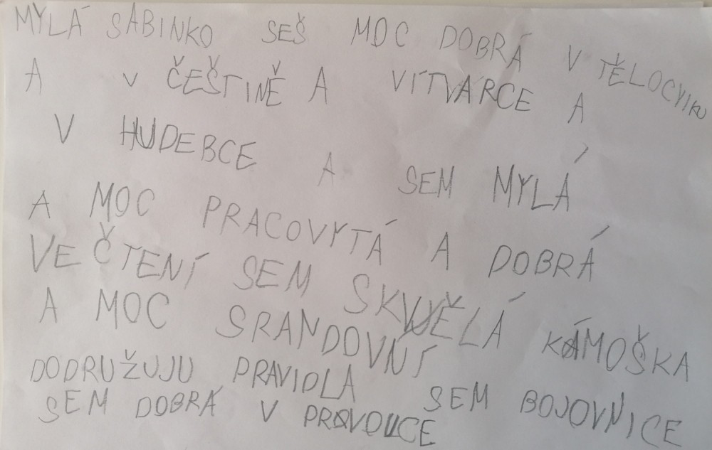 Kdo už byl bezradný, další věty ho nenapadaly, vyrazil po třídě. Zastavil se u každého spolužáka s dotazem: Co pěkného bys o mně řekl? Pokud se tazatel s větou ztotožnil, připsal si ji do svého dopisu. Některé laskavé věty spolužáky potěšily, jiné překvapily nebo nabídly jiný úhel pohledu na sebe.