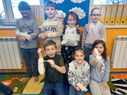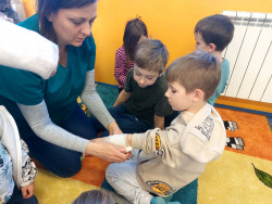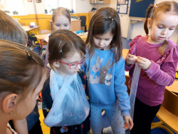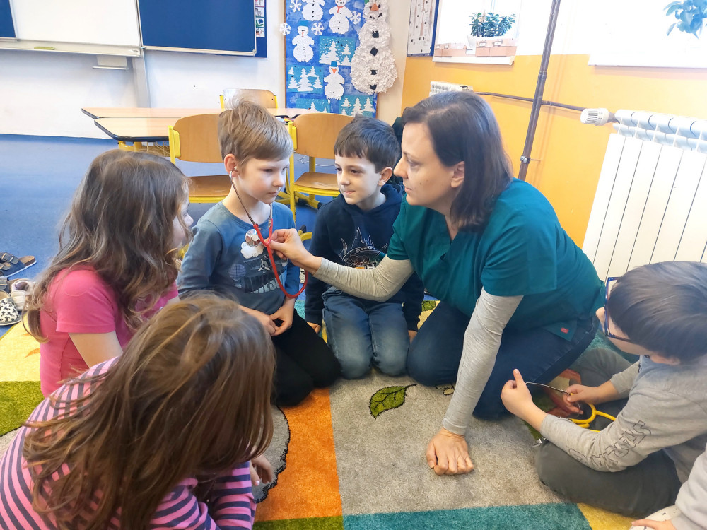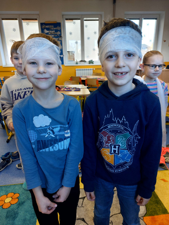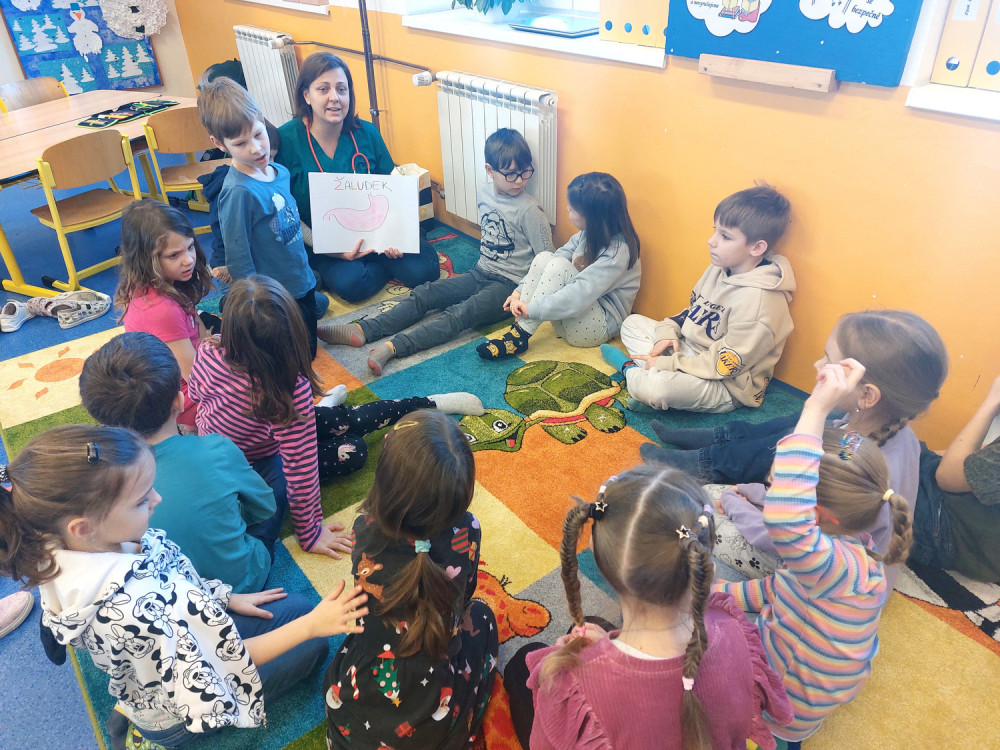 Do výuky za námi přišla maminka jednoho z nás. Pracuje jako lékařka v nemocnici. A tak jsme měli příležitost dovědět se hodně nového o našem těle, k čemu slouží některé orgány a co se děje, když onemocníme a musíme k lékaři. Viděli jsme rentgenové snímky hlavy a končetin a poslechli jsme si fonendoskopem svá srdíčka. S nadšením jsme se vzájemně obvazovali. To se nám docela dařilo a taky nás to moc bavilo. Za zdařilou práci každý z nás dostal injekční stříkačku.