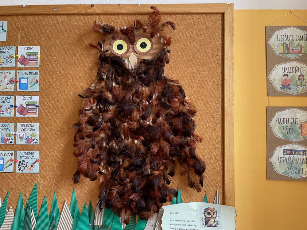 Děti z 1.C celý rok pilně pracovaly na tom, aby pomohly naší třídní sovičce. Na začátku roku byla celý holá a nyní se již pyšní krásným peřím, které jí děti "nakupovaly" za razítka získaná v pracovních sešitech. Sovička jim na oplátku prozradila cestu k pokladu. Ten našly u místního rybníka, ale nebylo to vůbec jednoduché - musely nejprve projít stezku "Cestu kolem světa" a zapamatovat si čísla, protože poklad byl ukryt v zakódovaném kufru. Ten se jim podařilo po pár pokusech zdolat a už se mohly těšit z opravdu štědrého pokladu.