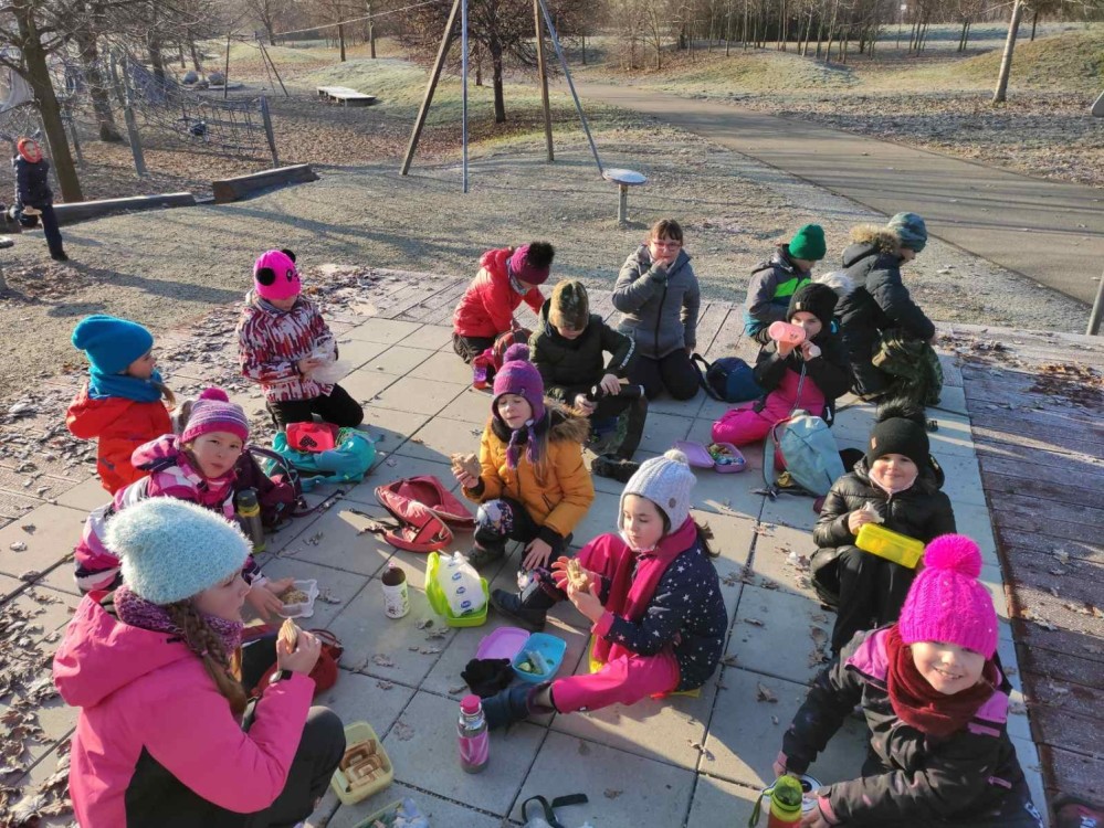 V rámci předvánočního těšení jsme vyrazili ven pátrat po místech, kde bychom mohli nechat něco dobrého pro zvířata v zimě. Děti si odhlasovaly pochod k Olympii a zpět. Po cestě jsme zachraňovali rybu pod ledem, dali tvrdé pečivo a ovoce ke krmelci v Přízřenicích. U Olympie jsme rozházeli semínka slunečnic po poli a nakrmili labutě v řece. Pro naše zdraví jsme ušli více než 6 km!